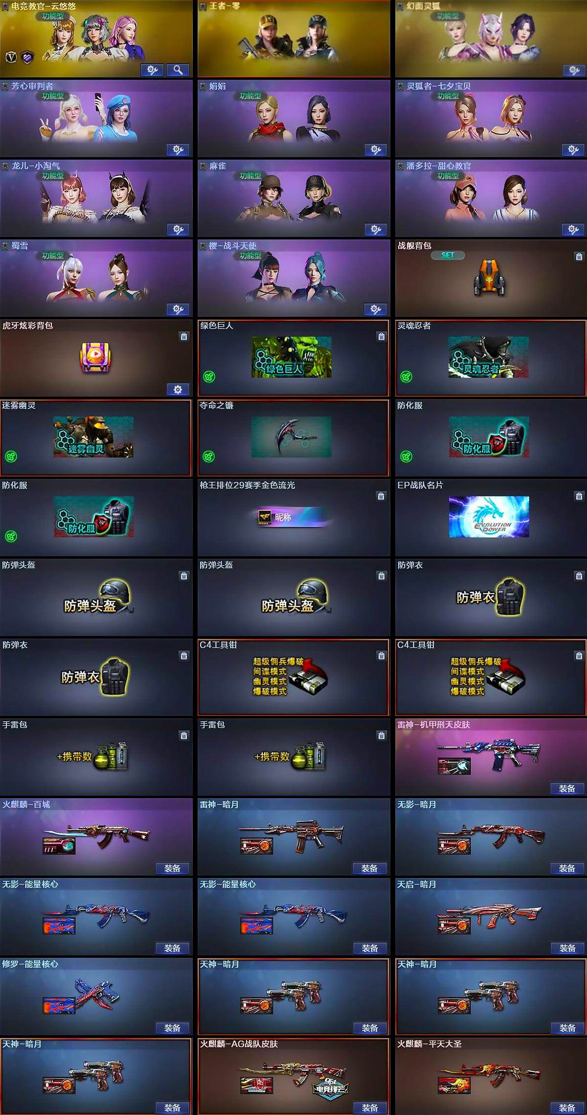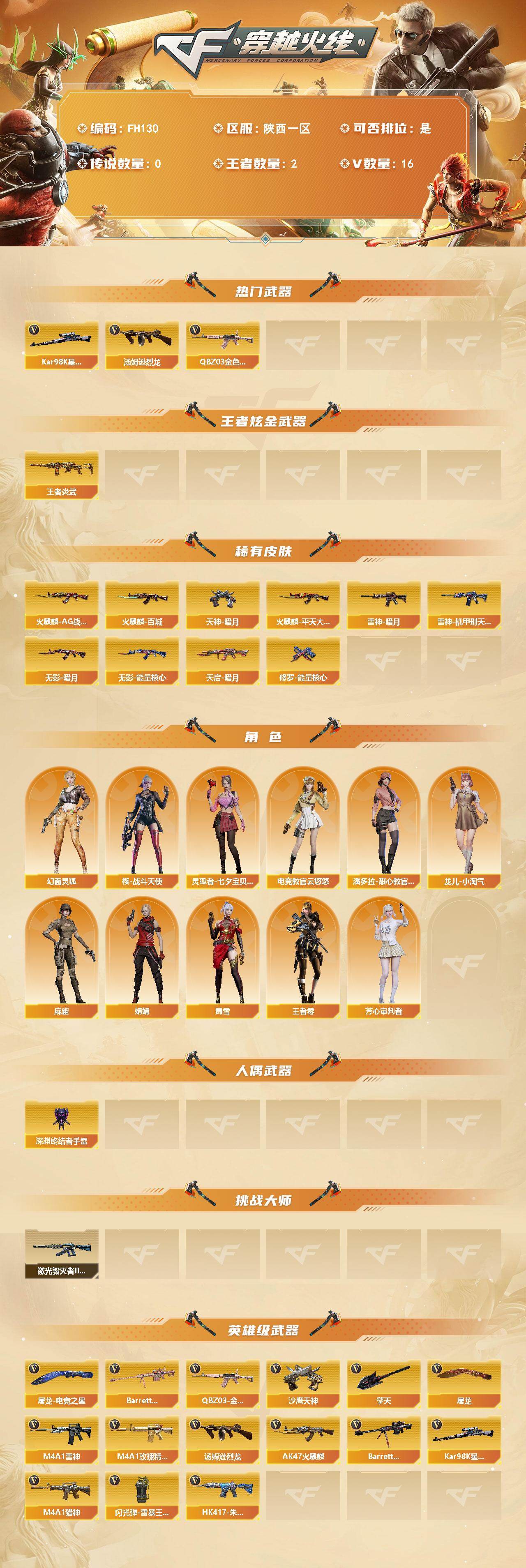 陕西一区-18V-2王者武器数-0炫金武器数【热门武器】:QBZ03-金色蔷薇,Kar98K-星神,汤姆逊-烈龙【王者炫金武器】:王者炎武【皮肤】:雷神-暗月,雷神-机甲刑天皮肤,火麒麟-AG战队皮肤,火麒麟-平天大圣,火麒麟-百城,无影-暗月,无影-能量核心*2,天启-暗月,修罗-能量核心,天神-暗月*3【角色】:电竞教官-云悠悠,王者-零,幻面灵狐,芳心审判者,娟娟,灵狐者-七夕宝贝,龙儿-小淘气,麻雀,潘多拉-甜心教官,蜀雪,樱-战斗天使【人偶武器】:深渊终结者手雷【挑战大师】:激光毁灭者