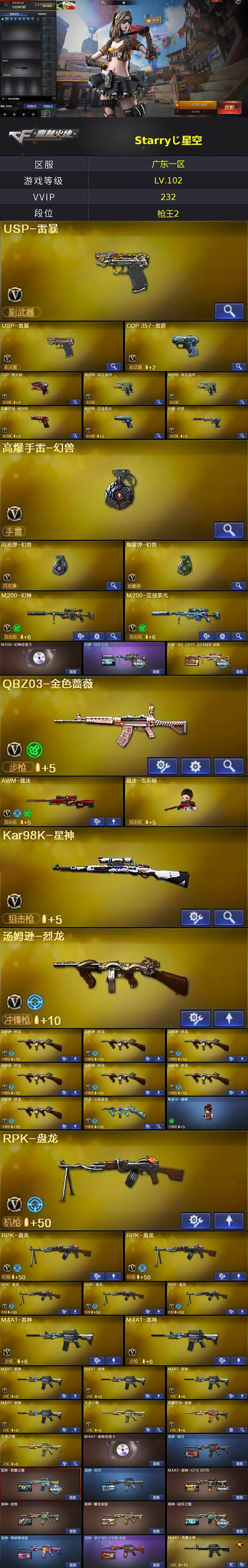 【热门武器】:QBZ03-金色蔷薇,M200-幻神,修罗-古蛇迷踪,M200-竞技荣光,荣耀世冠-火麒麟,荣耀世冠-雷神,荣耀世冠-柯尔特,Kar98K-星神,金色小号,Cat-刀锋,M4A1-黑骑士*2,汤姆逊-烈龙*8,RPK-盘龙*6,加特林-炼狱,斯泰尔-蝴蝶,裁决-雪莉杨,USP-雷暴*2,COP-堕天神,COP 357-雷霆王者,沙鹰-修罗*6,荣耀世冠-龙啸*2,高爆手雷-幻兽