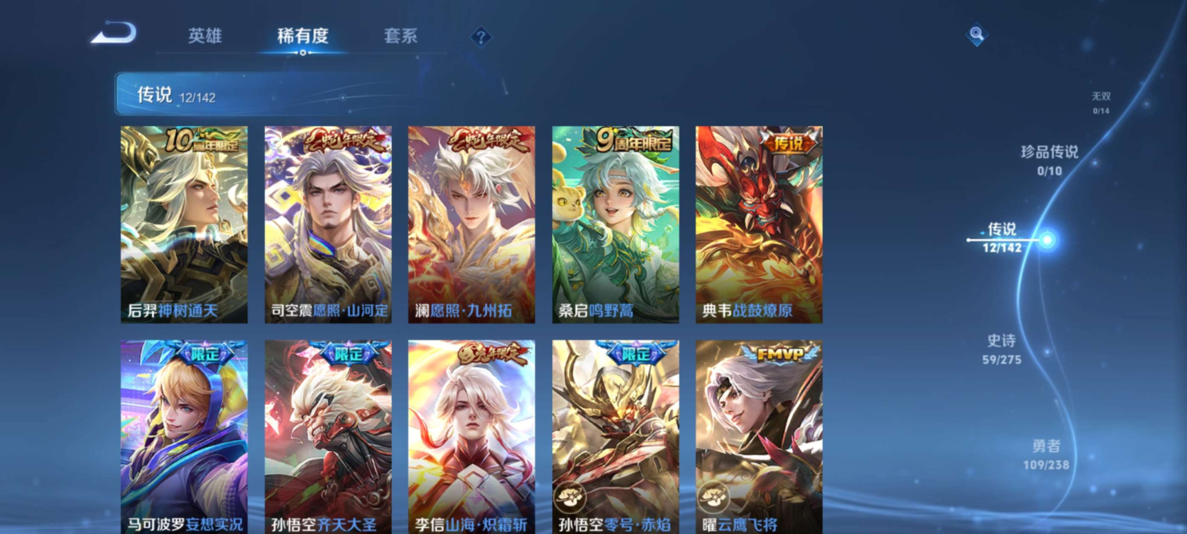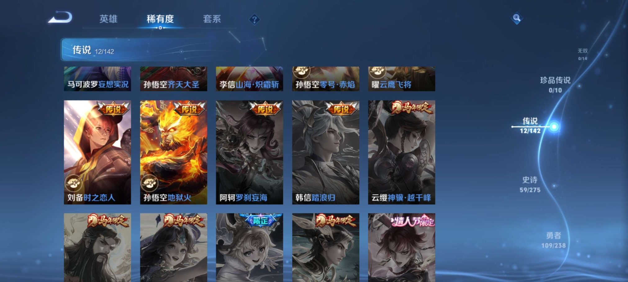 【12 传说皮肤】零号·赤焰 孙悟空,地狱火 孙悟空,云鹰飞将 曜,齐天大圣 孙悟空,时之恋人 刘备,山海·炽霜斩 李信,战鼓燎原 典韦,妄想实况 马可波罗,愿照·九州拓 澜,神树通天 后羿,愿照·山河定 司空震,鸣野蒿 桑启,