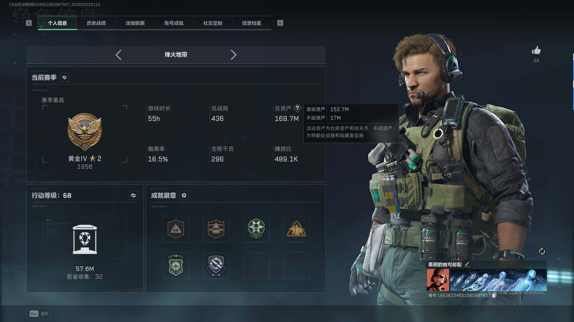 166m总资产-8514k哈夫币-60烽火等级-黄金-24战场等级-上等兵