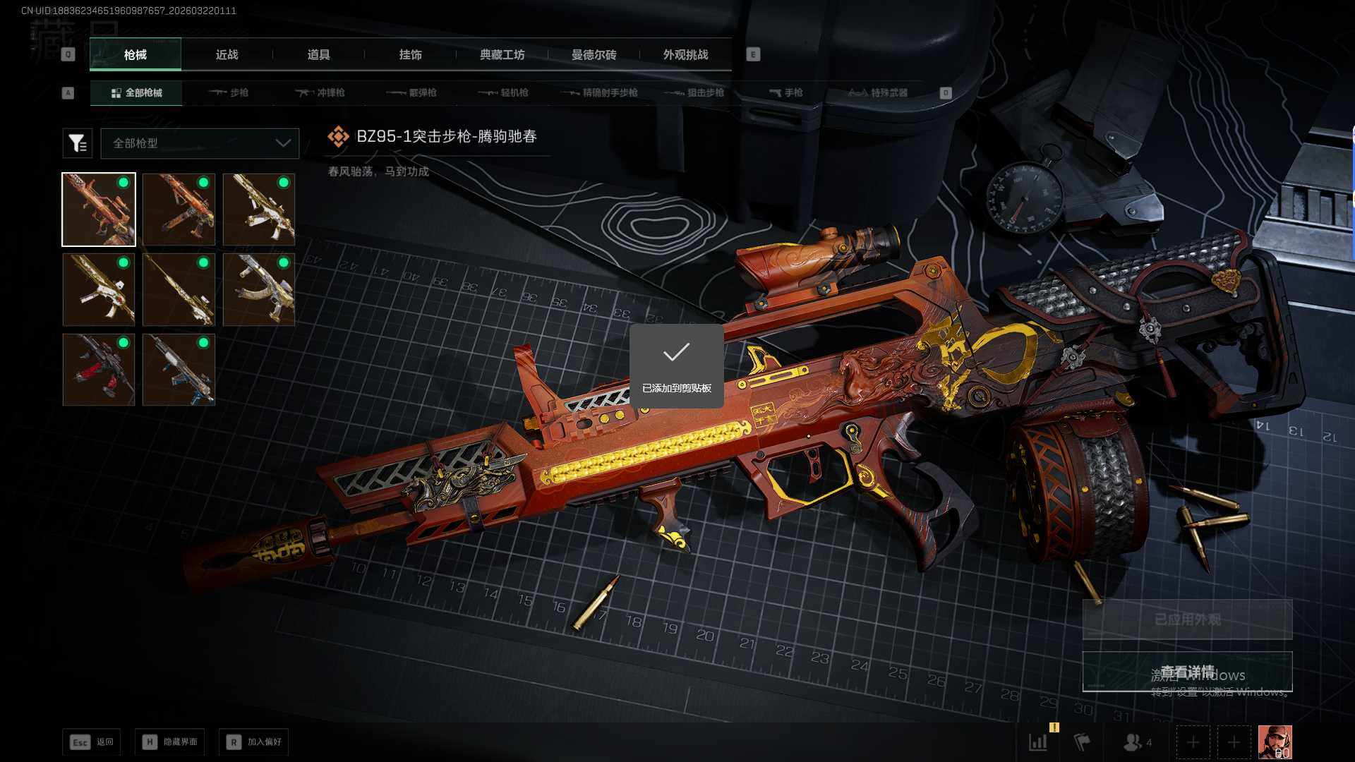 【传说外观】:QBZ95-1突击步枪-腾驹驰春,腾龙突击步枪-万金泪冠,MK47突击步枪-暗星,SMG-45冲锋枪-腾驹驰春,SR-3M紧凑突击步枪-暗星,勇士冲锋枪-万金泪冠,SKS射手步枪-骑士,AWM狙击步枪-万金泪冠