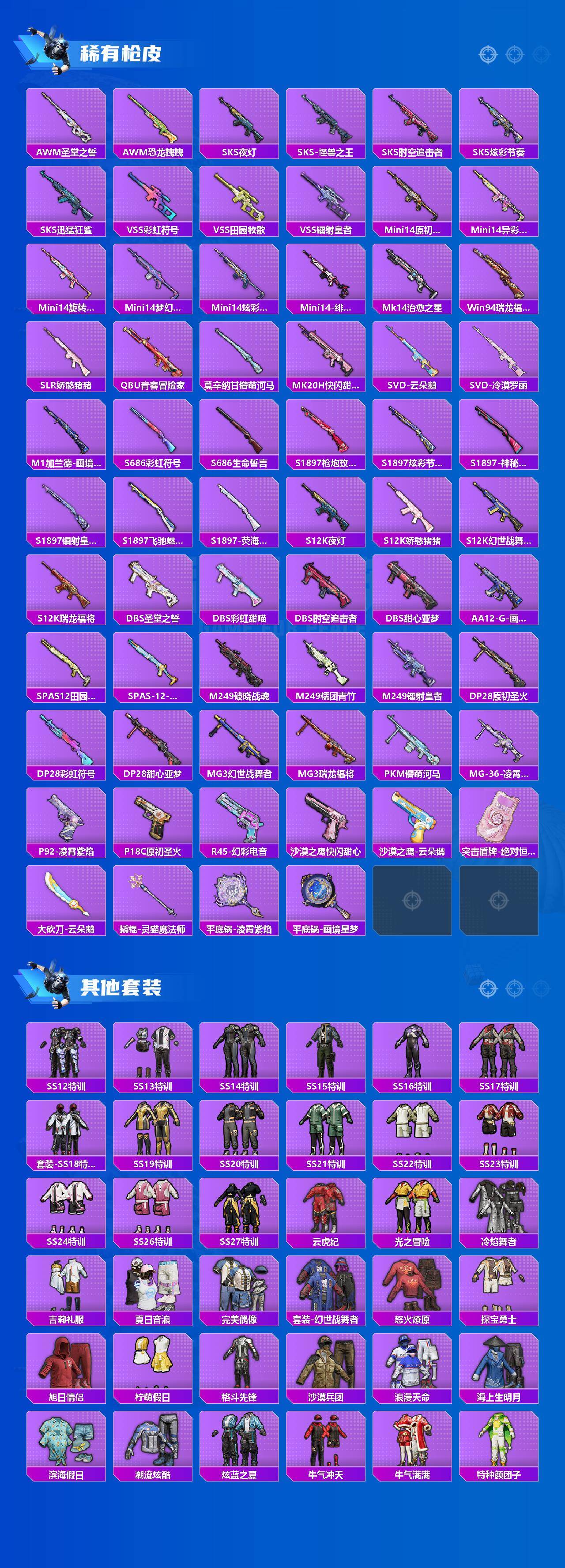 身法号-塞维尔2级/第五大道/羊梦糖心/SCAR梦幻火箭7级/M4灵猫魔法师3级/小丑鱼/奇异狩猎者/暗夜魅影/粉红小猪/浪漫天命/迅捷狂鲨/浪漫波比/兔兔白日梦/秘语星愿/激萌罗小黑/小鸟芋圆/蜜露汐语/蜜桃特工/碧影闪光/月影灵韵/霁蓝缠春/幻彩电音/绝对恒星/M762甜蜜誓约7级/M762激战未来5级/黑曜夜骑/特斯拉(蓝)(1红装-8粉装-10粉枪-2载具)没战神框 HP6853-3粉色