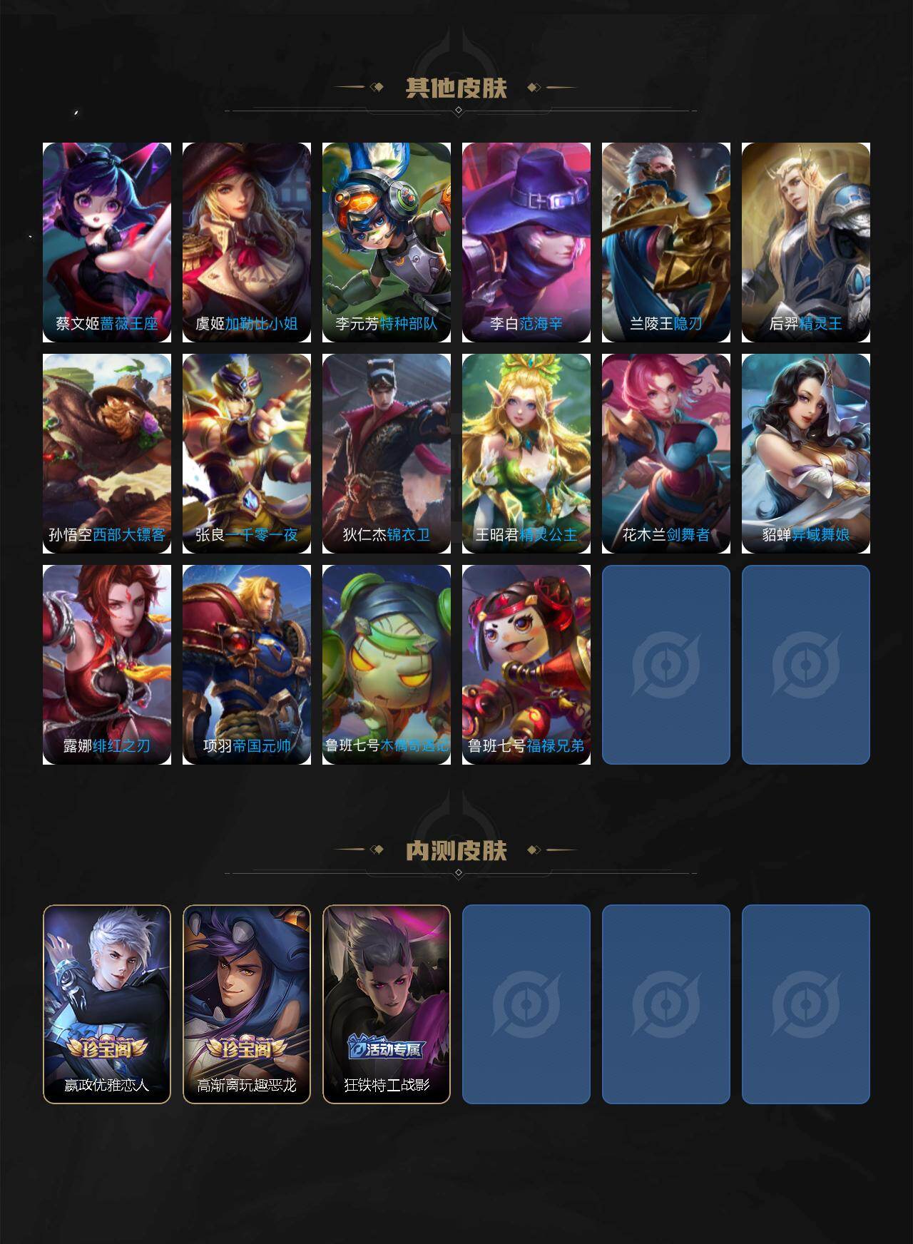 【限定皮肤】:姜子牙天穹之誓,狄仁杰阴阳师,赵云皇家上将,墨子神迹守卫,嬴政优雅恋人,高渐离玩趣恶龙,芈月重明,夏侯惇朔风刀,甄姬游园惊梦,曹操烛龙,典韦穷奇,典韦蓝
