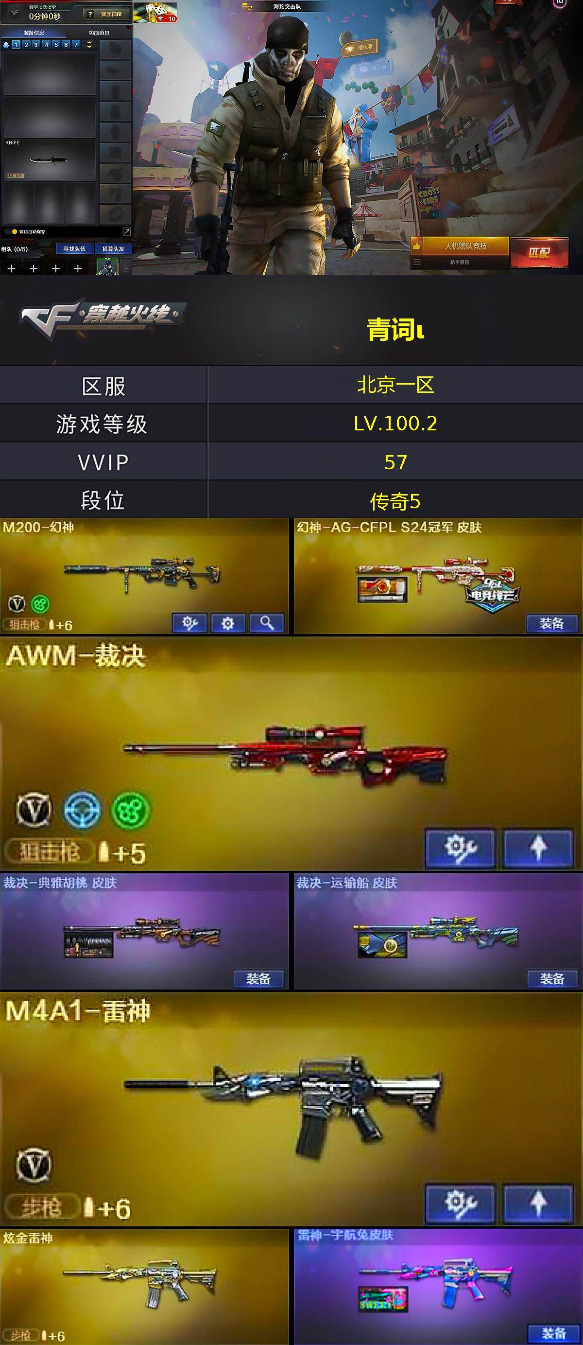 【ky5592】北京一区-56V-8王者武器数-11炫金武器数【热门武器】:HK417-朱雀,M200-幻神,加特林-炼狱*4,沙鹰-修罗*4【王者炫金武器】:王者之鲨,王者之戮,王者之翼,王者之武,王者霜心,王者之击,王者之锋*2,炫金骑士*4,炫金雷神,炫金毁灭,炫金天龙*5【音效卡】:死神-雪域霜狐-怀旧音效卡【皮肤】:幻神-AG-CFPL S24冠军 皮肤,裁决-典雅胡桃 皮肤,裁决-运输船 皮肤,雷神-宇航兔皮肤,火麒麟-巅峰荣耀,火麒麟-典雅胡桃 皮肤,毁灭耀金皮肤*3,毁灭-星空,