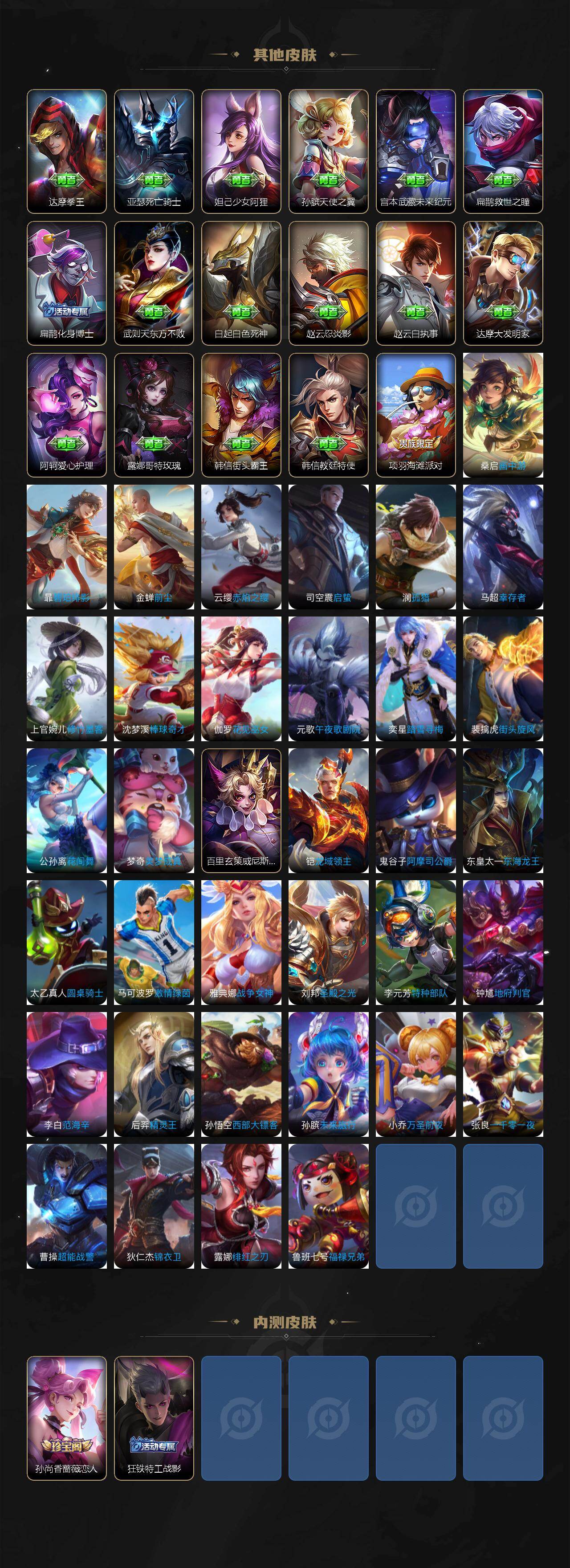 【限定皮肤】:姜子牙天穹之誓,李白谪仙醉月,狄仁杰阴阳师,赵云皇家上将,孙尚香蔷薇恋人,元歌云间偶戏,元歌无心,夏侯惇朔风刀,典韦穷奇,狄仁杰魔术师,狄仁杰万华元夜,项羽海滩派对,老夫子醍醐杖,程咬金演武夺筹,韩信飞衡,亚瑟潮玩骑士王