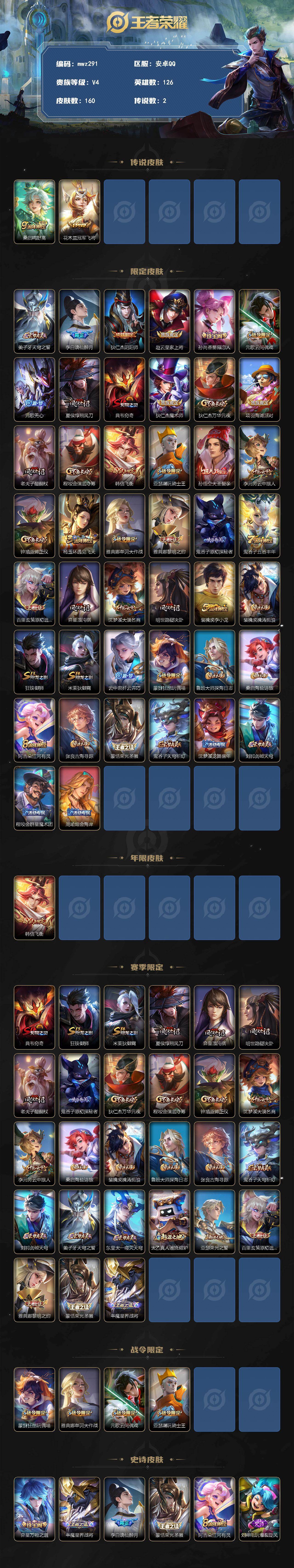 【mwz291】安卓Q-V4-至尊星耀IV段位-126英雄-160皮肤-2传说-40史诗
