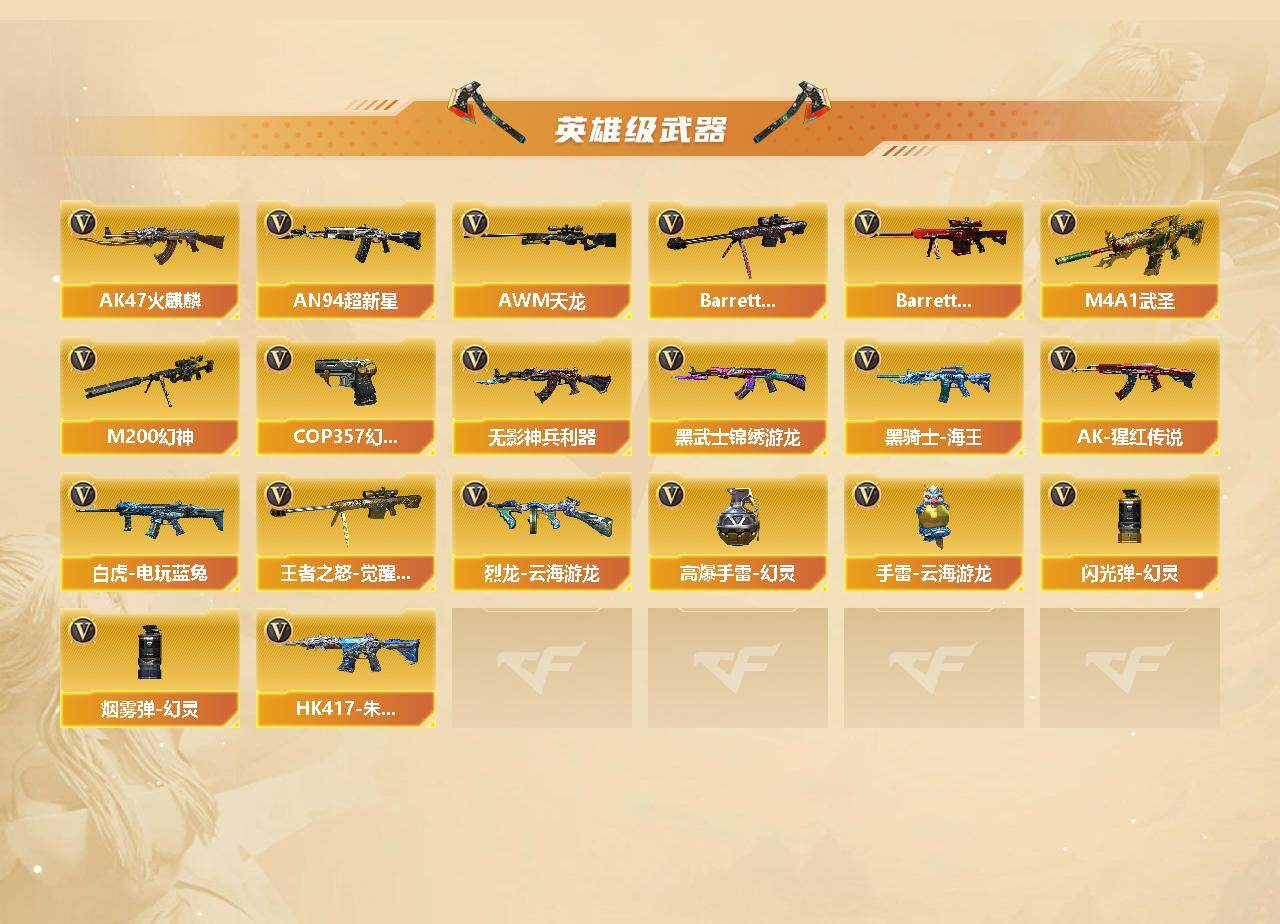 【热门武器】:传说暗裔,QBZ03-金色蔷薇,M200-幻神,白虎-电玩蓝兔,金色小号,M4A1-黑骑士,汤姆逊-烈龙*2,RPK-盘龙,斯泰尔-蝴蝶,COP 357-幻灵,沙鹰-修罗