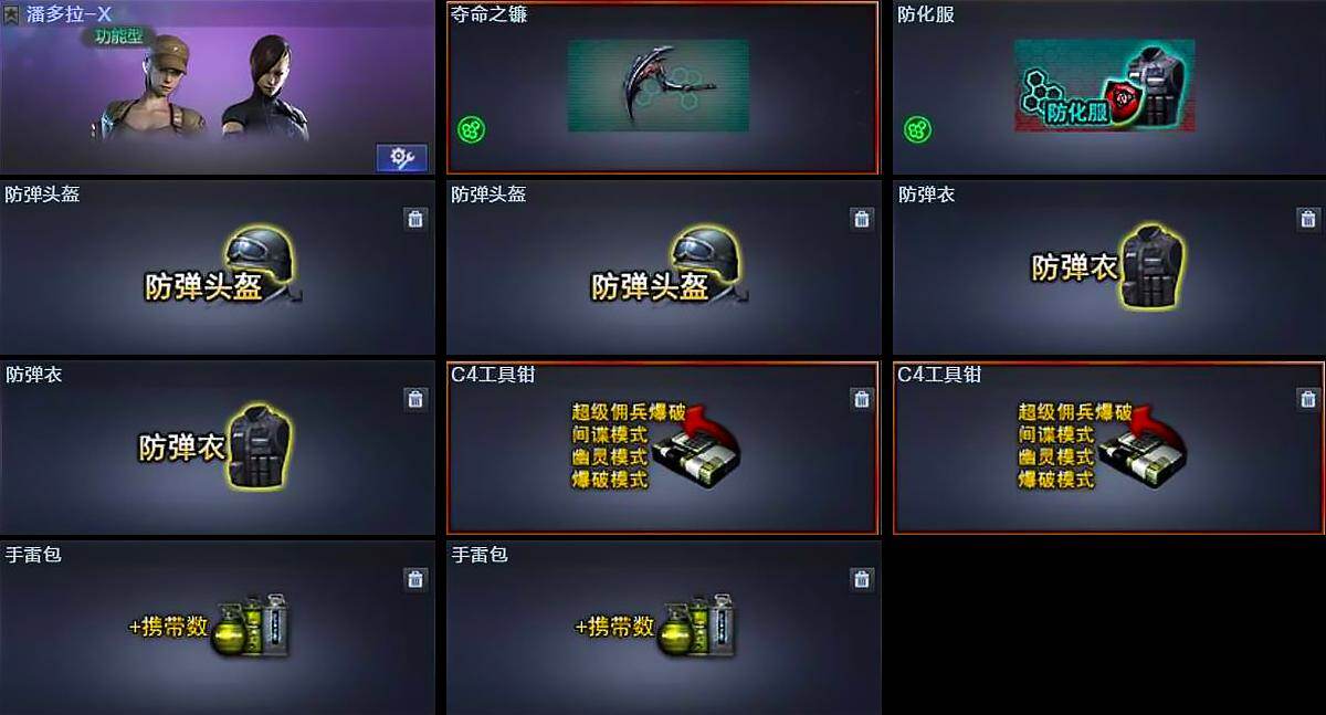 【道具】:夺命之镰,防化服,防弹头盔*2,防弹衣*2,C4工具钳*2,手雷包*2