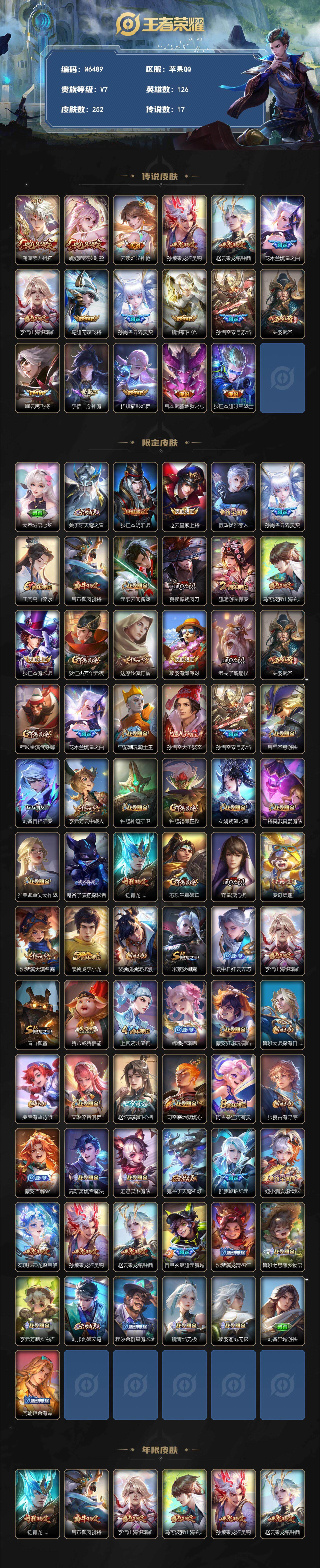苹果Q-V6-最强王者段位-126英雄-252皮肤-17传说-74史诗