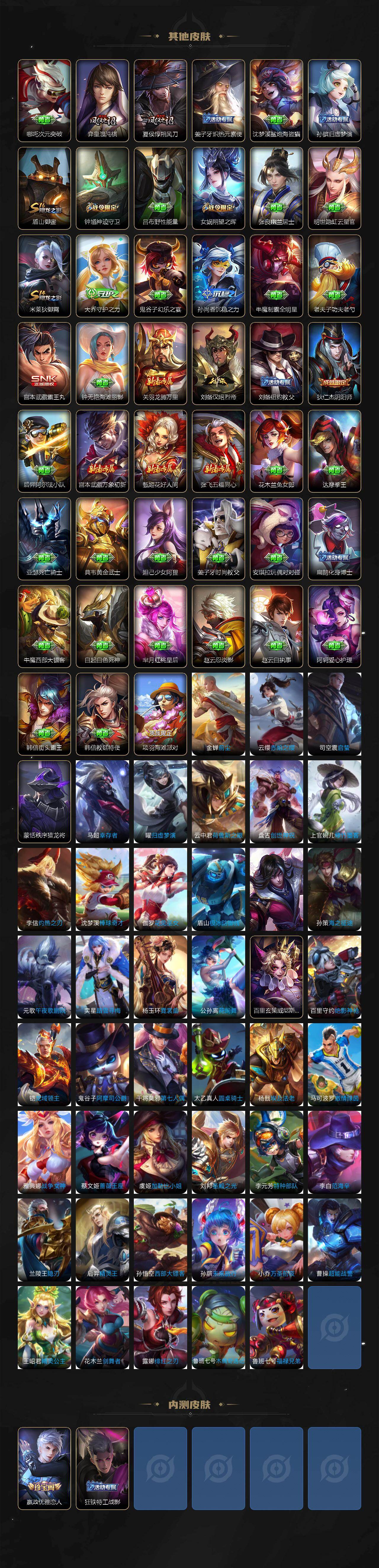 【传说皮肤】:澜愿照九州拓,虞姬愿照岁时盈,云缨幻光神枪,孙策乘龙淬吴钩,赵云乘龙铭钟鼎,花木兰燃星之曲,李信山海炽霜斩,马超无双飞将,孙尚香异界灵契,镜炽阳神光,孙悟空零号赤焰,关羽武圣,曜云鹰飞将,李信一念神魔,貂蝉猫影幻舞,宫本武藏地狱之眼,狄仁杰超时空战士