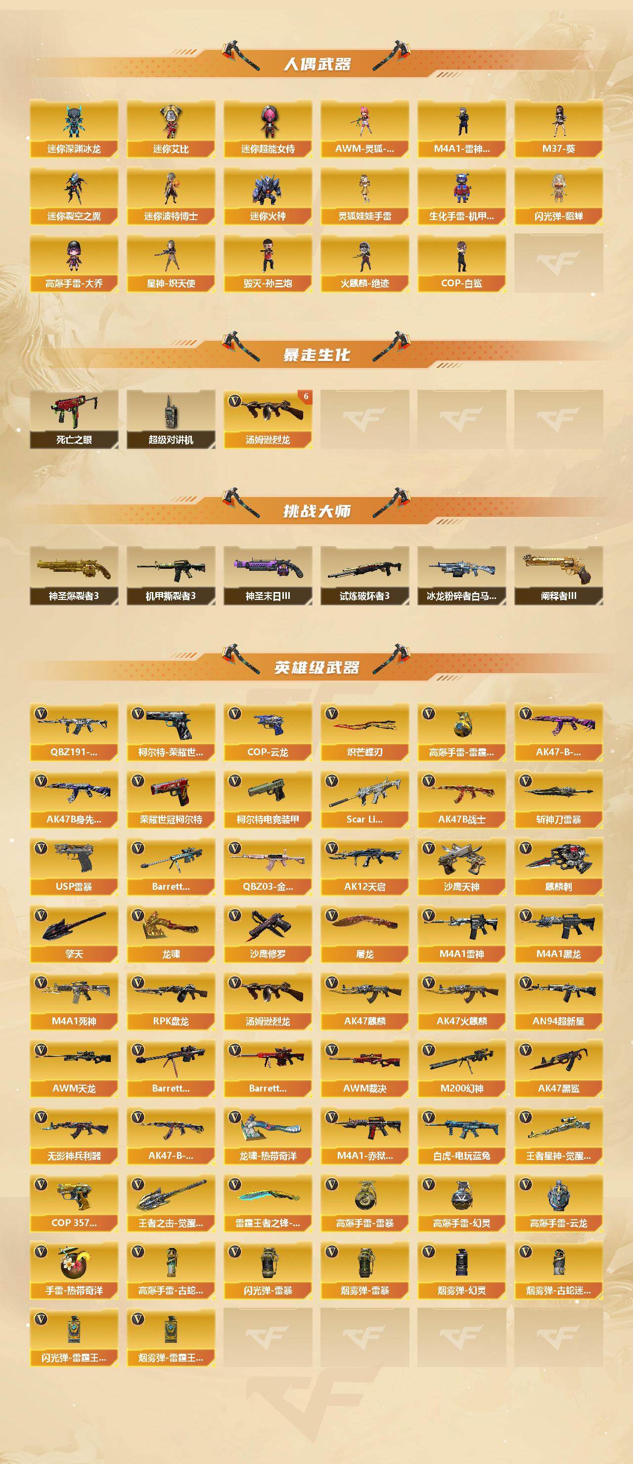 【热门武器】:传说光耀,传说破晓,QBZ03-金色蔷薇,Scar Light-白虎,M200-幻神*2,柯尔特-荣耀世冠白鲨2023,死亡之眼,白虎-电玩蓝兔,荣耀世冠-柯尔特,汤姆逊-烈龙*6,RPK-盘龙*2,毁灭-孙三炮,火麒麟-绝迹,COP-白鲨,USP-雷暴,沙鹰-修罗*2,炽芒蝶刃,金刚伞