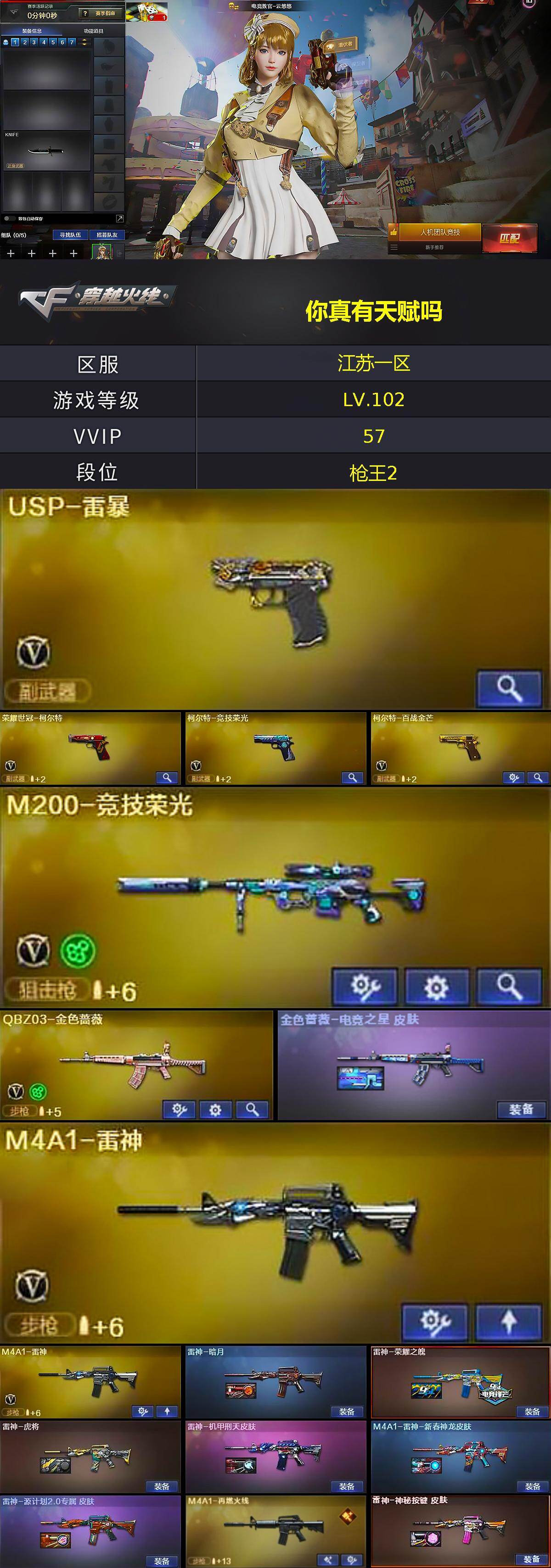 江苏一区-59V-2王者-0炫金【热门武器】:QBZ03-金色蔷薇,修罗-古蛇迷踪,M200-竞技荣光,荣耀世冠-柯尔特,M4A1-黑骑士,USP-雷暴,沙鹰-修罗,黄金猫猫手套-白鲨【音效卡】:M4A1-黑骑士音效卡,N9语音包,沙鹰-修罗-盛典舞曲音效卡*2,M4A1-赤狱骑士-怀旧音效卡,炼狱-百战金芒-庆典舞曲音效卡【皮肤】:金色蔷薇-电竞之星 皮肤,雷神-暗月,雷神-荣耀之魄,雷神-虎将,雷神-机甲刑天皮肤,M4A1-雷神-新春神龙皮肤,雷神-源计划2.0专属 皮肤,M4A1-再燃火线
