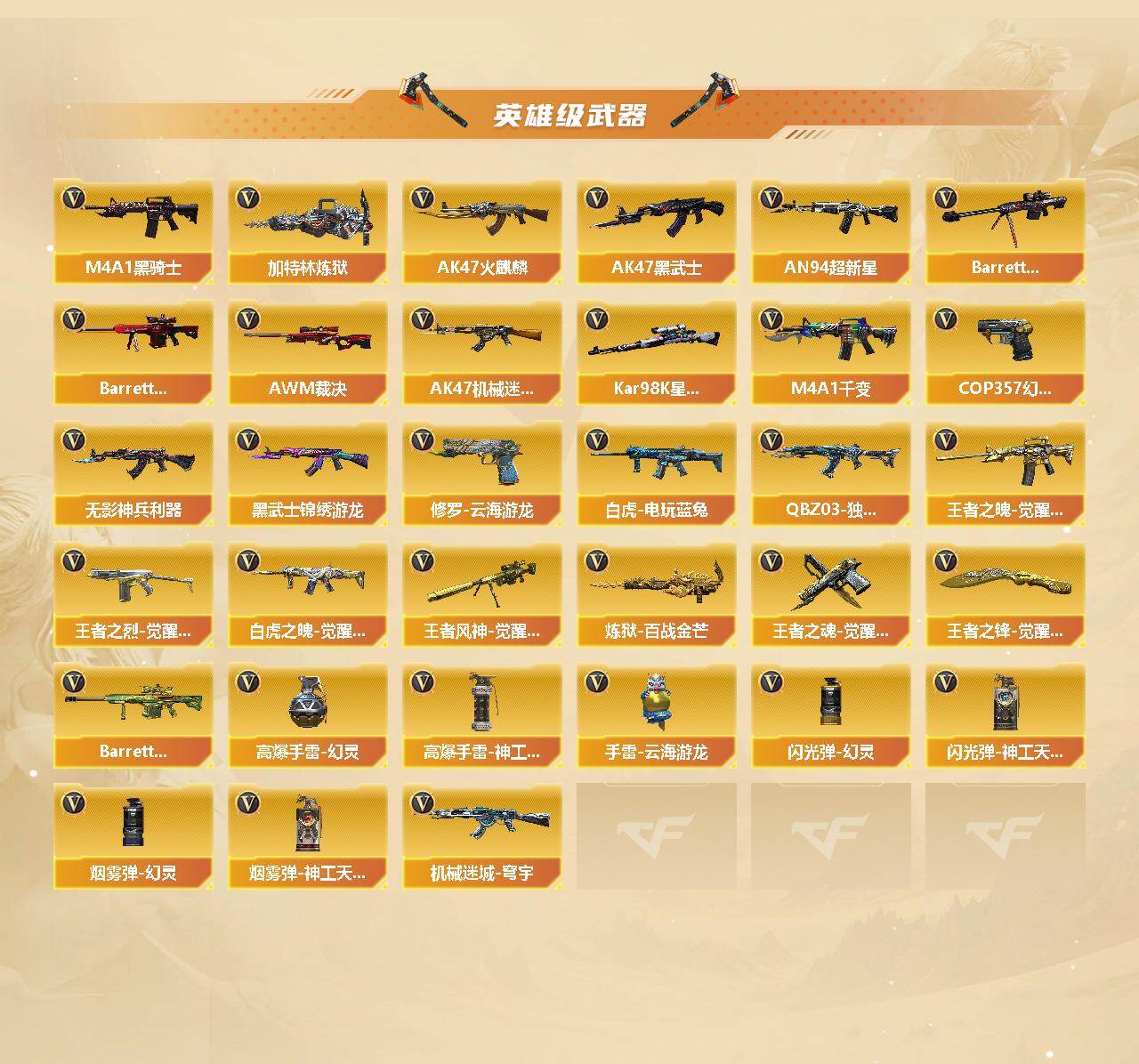 【热门武器】:QBZ03-金色蔷薇*2,白虎-电玩蓝兔,Kar98K-星神,M4A1-黑骑士,加特林-炼狱,雷神-小红,火麒麟-绝迹,COP-白鲨,COP 357-幻灵,沙鹰-修罗*4,炽芒蝶刃,金刚伞