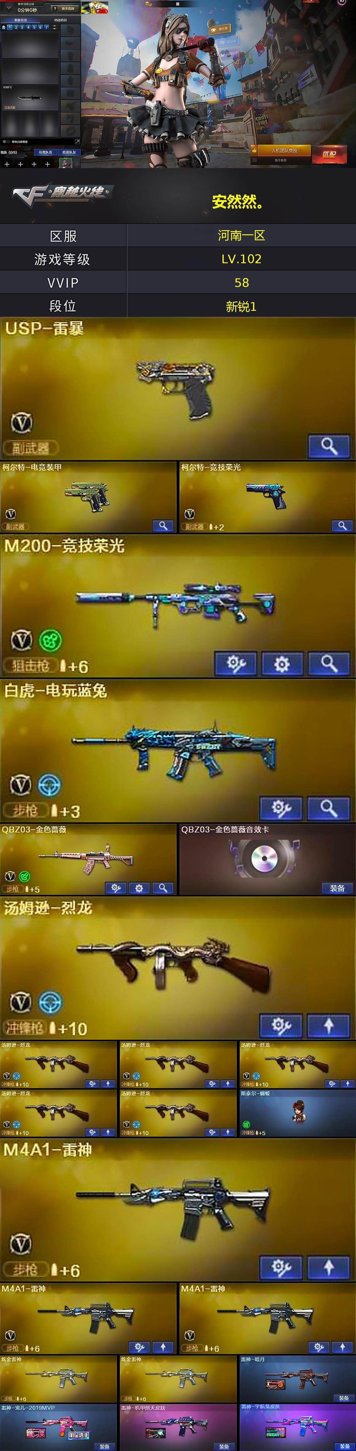 【ky5548】河南一区-62V-4王者武器数-3炫金武器数【热门武器】:QBZ03-金色蔷薇,M200-竞技荣光,死亡之眼,白虎-电玩蓝兔,M4A1-黑骑士,汤姆逊-烈龙*6,斯泰尔-蝴蝶,雷神-小红,USP-雷暴,沙鹰-修罗*3【王者炫金武器】:炫金骑士,炫金雷神*2【音效卡】:M4A1-黑龙音效卡,M4A1-黑骑士音效卡,绝迹语音包【皮肤】:雷神-暗月,雷神-宠儿-2019MVP,雷神-机甲刑天皮肤,雷神-宇航兔皮肤,火麒麟-平天大圣,火麒麟-百城,毁灭-暗月,毁灭-黑大圣皮肤*2,毁灭-