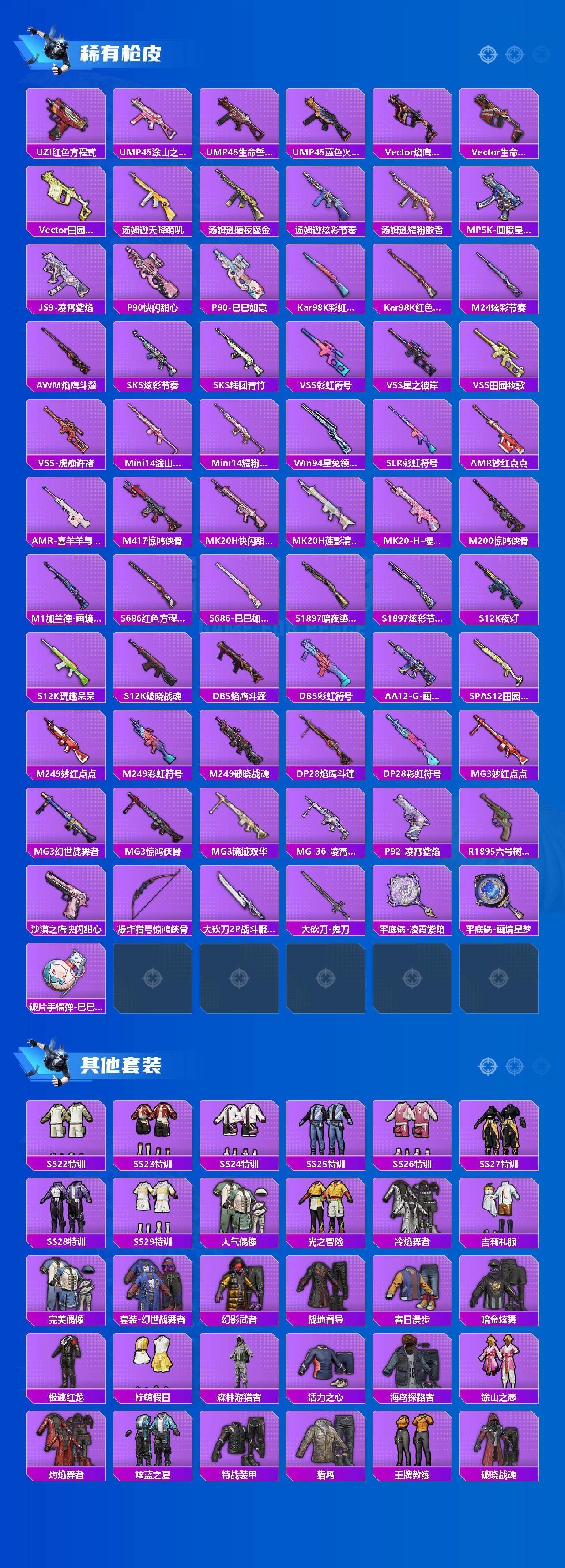 【粉色枪皮等级】:AKM-绿萝繁花(五级),SCAR-L-锦绣绵绵(五级),Kar98K-巳巳如意(五级),Mk14-福马献瑞(五级),AA12-G-萌骑幻想(五级),DP-28-豹影疾电(五级)