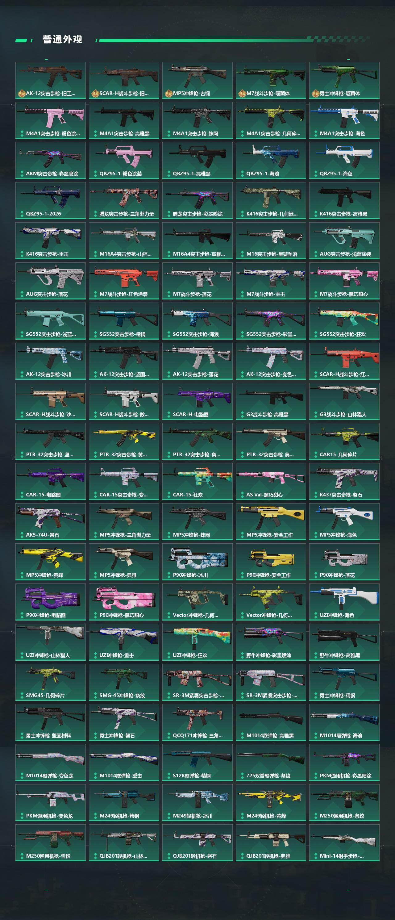 【传说外观】:M4A1突击步枪-蚀金玫瑰,M4A1突击步枪-阿米娅,AKM突击步枪-锦绣,ASh-12战斗步枪-鹅鸭杀,K416突击步枪-行动记录,AUG突击步枪-
