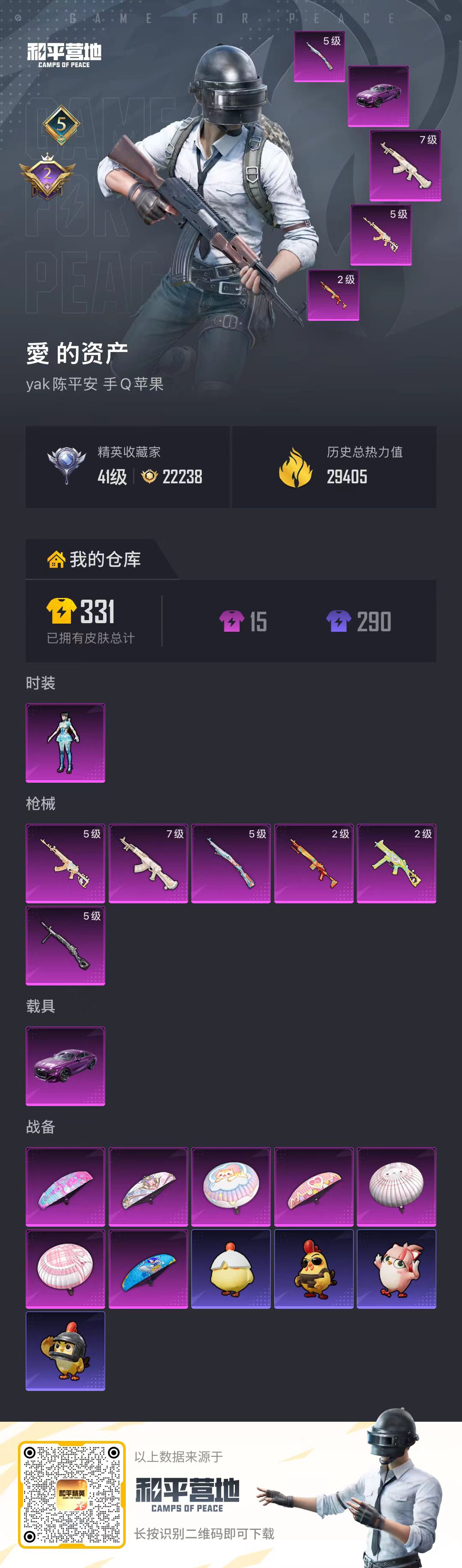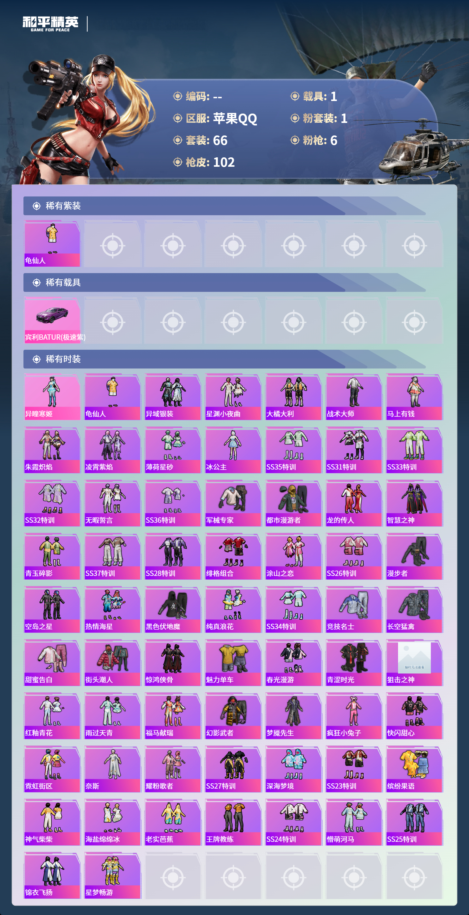 hs65902苹果手Q-5王牌印记-1粉装-6特效枪-1载具-29405热力值-66套装-102枪皮-2卓越印记