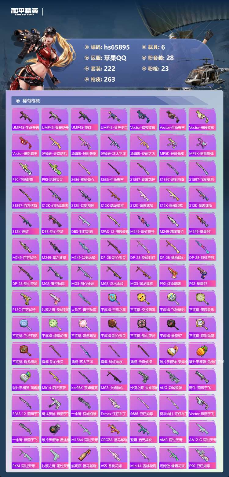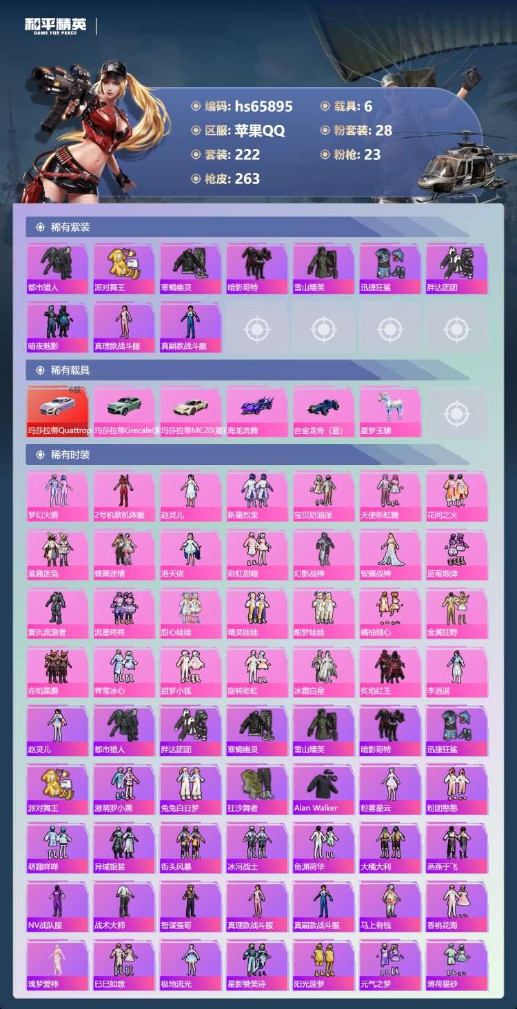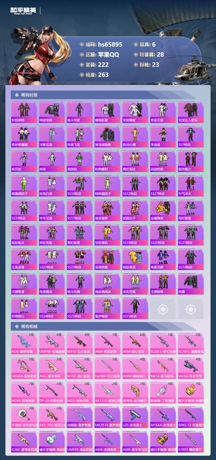 hs65895 苹果手Q-26王牌印记-有战神框-28粉装-23特效枪-6载具-123739热力值-