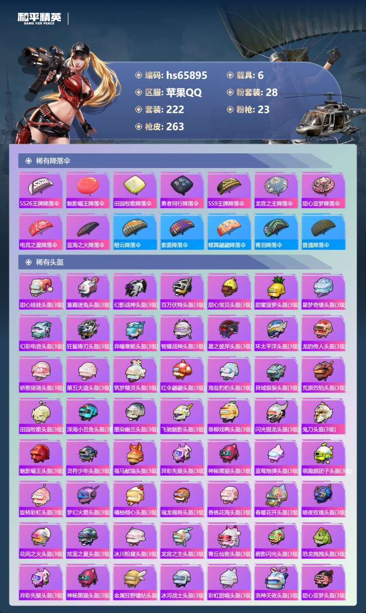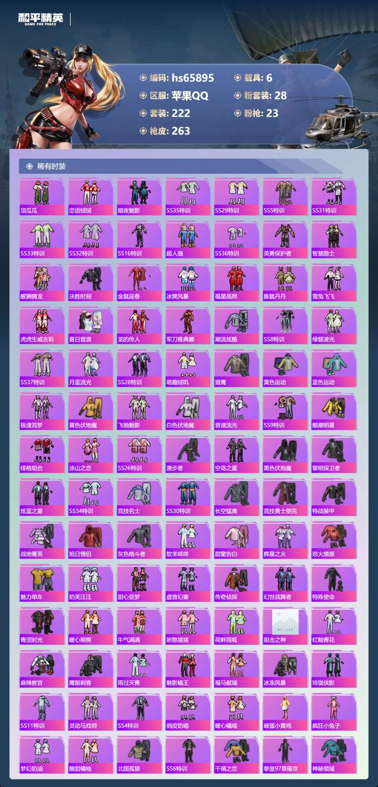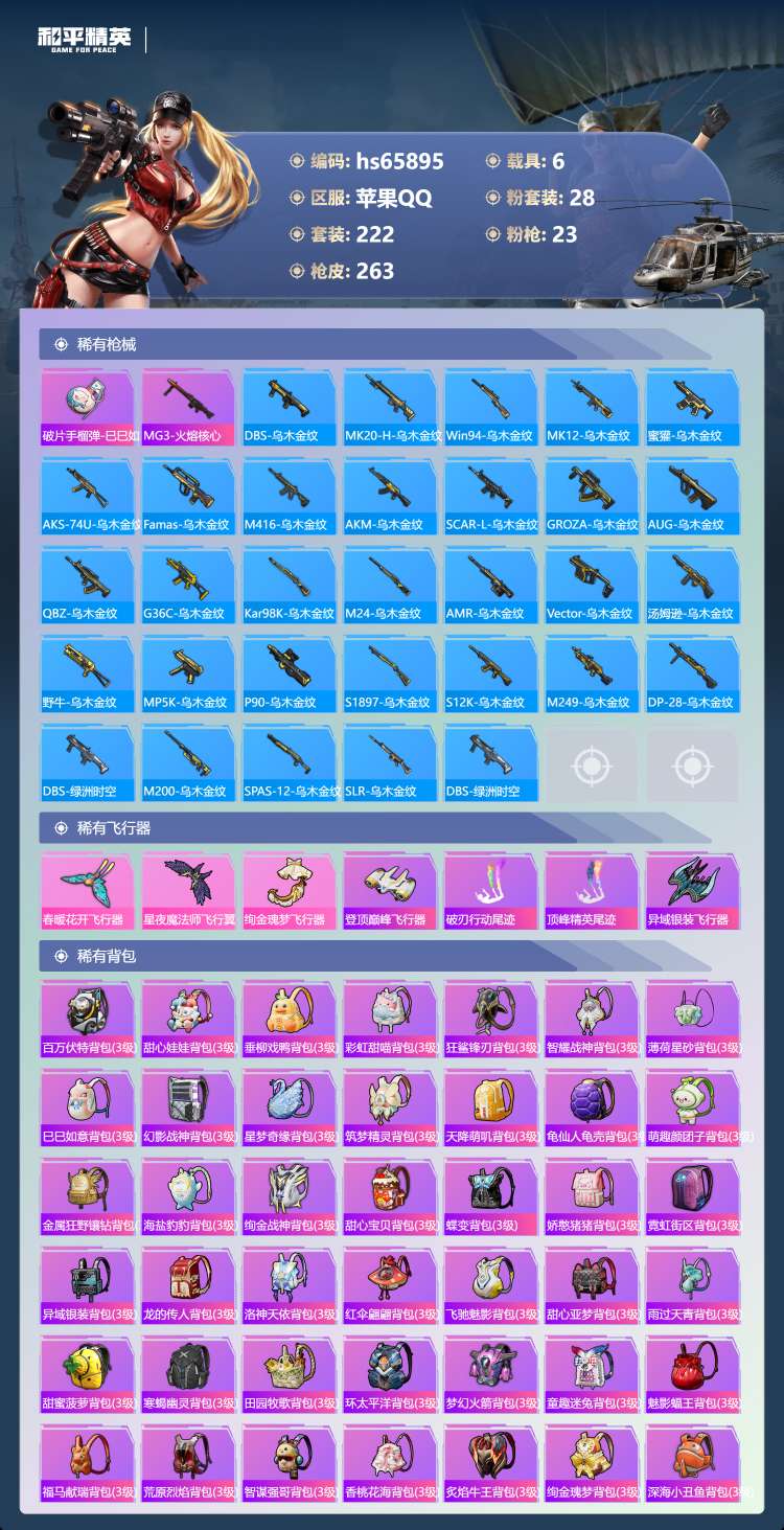hs65895 苹果手Q-26王牌印记-有战神框-28粉装-23特效枪-6载具-123739热力值-