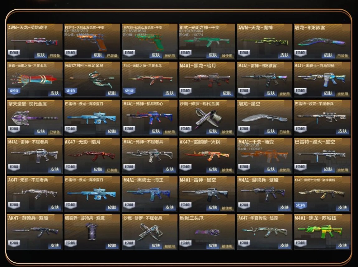 【安卓QQ】 角色等级:元首 【角色】瞳、步练师 【武器】王者之影、王者之隐、AK47-奉先、AWM-天龙、巴雷特-雷霆、98K-星神、M4A1-雷神、M4A1-太白诗仙、AK47-雷霆、AUG-机械纪元、CBJ-MS-毒蜂、MK47-机械纪元、汤姆逊-烈龙、COP 357-堕天神、尼泊尔-雷霆、尼泊尔-机械纪元、墨刃-幻神、双脊龙趾、M4A1-死神、加特林-蟒蛇、加特林-堡垒、地狱烈炎、HK417-炎龙铠甲、QBZ03-天罚、KSG-钟馗觉醒、烈焰弓、QSZ92-冰魂觉醒、末日裁决觉醒、烈焰刀