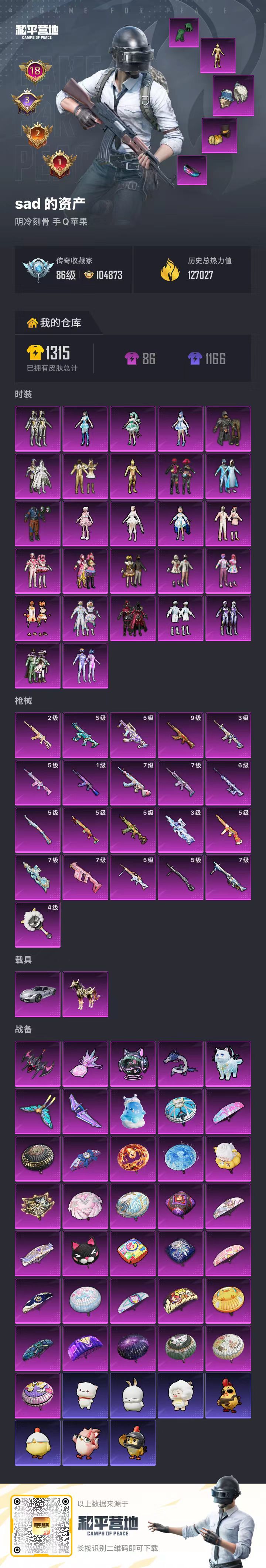 hs65881 苹果手Q-18王牌印记-有战神框-27粉装-21特效枪-2载具-127115热力值-