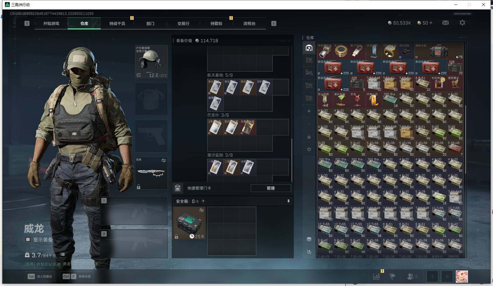 总资产(M):208M/哈夫币(K):60533K/传说枪皮数:23/全面战场等级:14_段位:列兵/烽火地带等级:60_段位:黑鹰