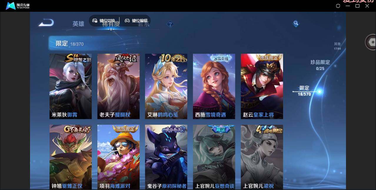 【限定皮肤】:狄仁杰阴阳师,赵云皇家上将,狄仁杰魔术师,项羽海滩派对,老夫子醍醐杖,程咬金演武夺筹,兰陵王金庭之子,牛魔御旌,钟馗驱傩正仪,鬼谷子原初探秘者,明世隐疑决卦,狂铁御狮,米莱狄御霄,盾山御銮