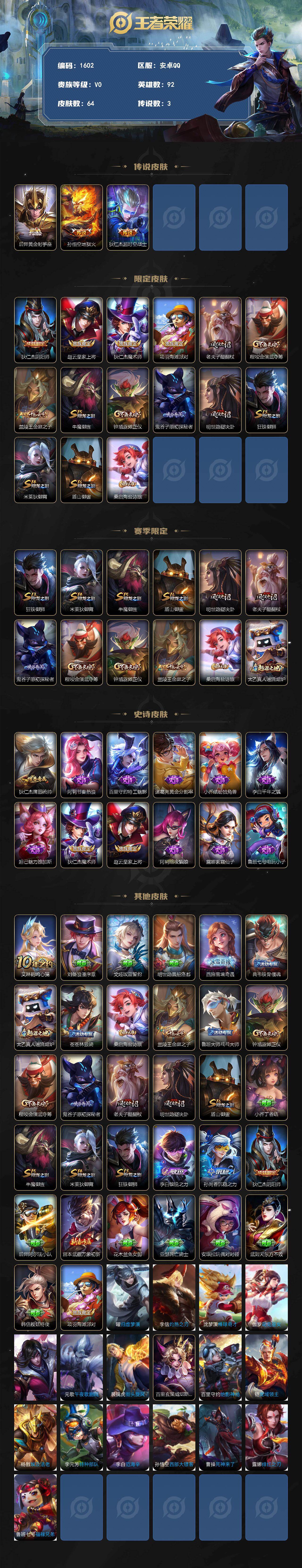 2618529 王者荣耀账号 安卓Q-V6-永恒钻石V段位-92英雄-64皮肤-3传说-12史诗
