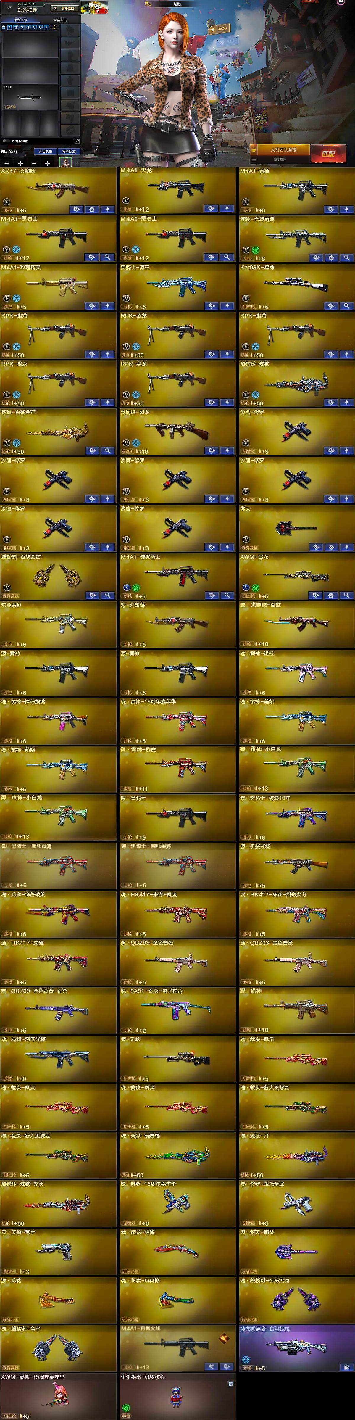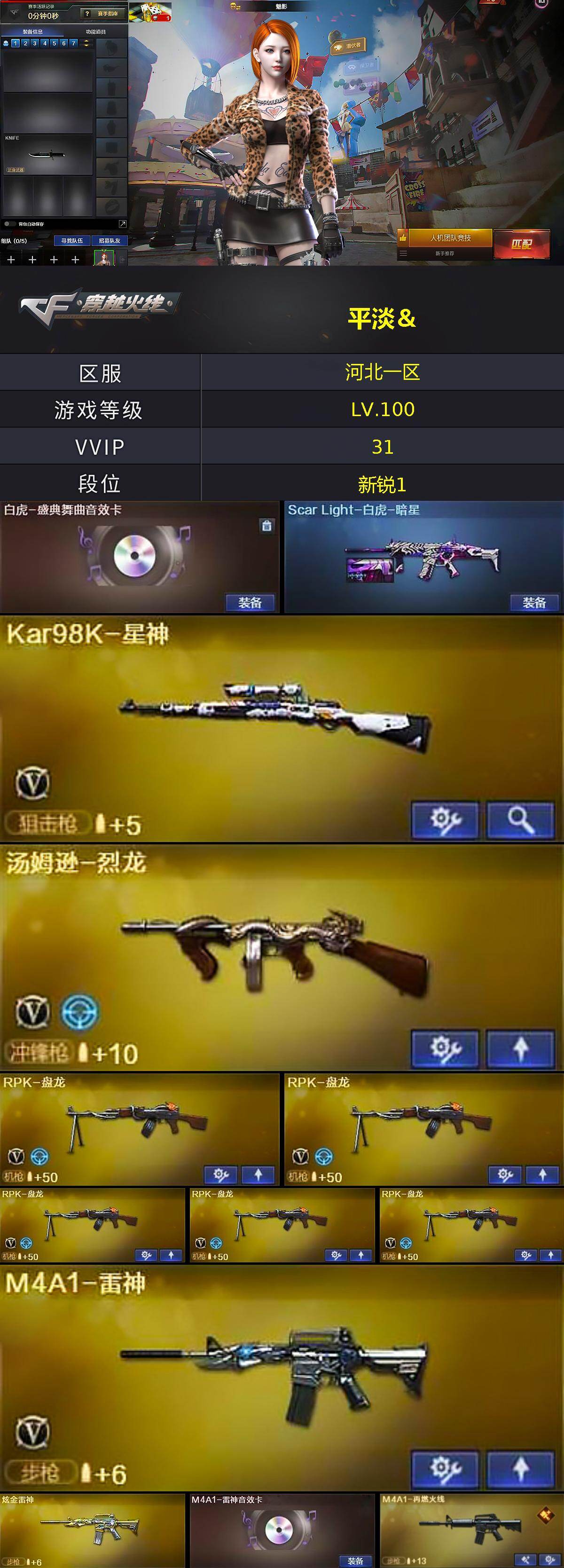 【ky5380】河北一区-30V-0王者武器数-1炫金武器数【热门武器】:Kar98K-星神,M4A1-黑骑士*2,汤姆逊-烈龙,RPK-盘龙*5,加特林-炼狱,沙鹰-修罗*6【王者炫金武器】:炫金雷神【音效卡】:M4A1-雷神音效卡,沙鹰-修罗-盛典舞曲音效卡*2,白虎-盛典舞曲音效卡,炼狱-百战金芒-庆典舞曲音效卡,死神-雪域霜狐-怀旧音效卡,AWM-昌龙-怀旧音效卡【皮肤】:Scar Light-白虎-暗星,M4A1-再燃火线,毁灭-风暴,M4A1-千变-孔明皮肤,修罗-能量核心,修罗-百