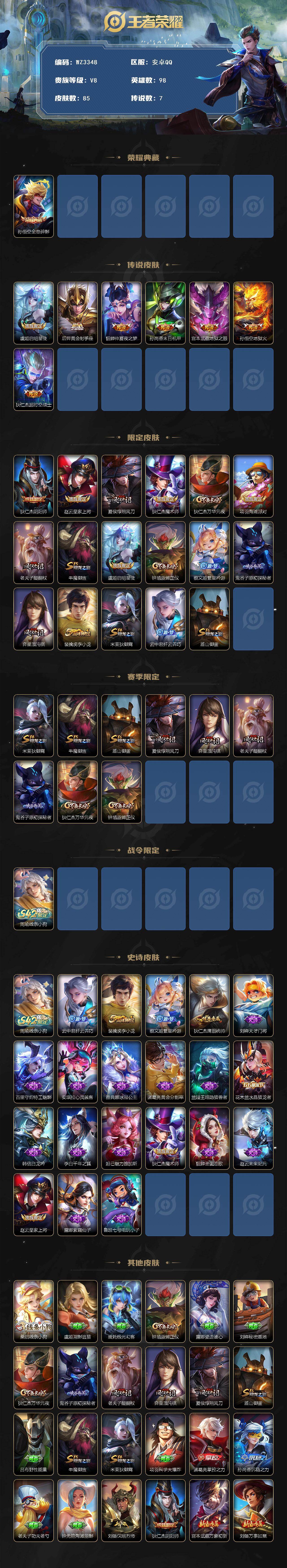 【秒换绑】安卓Q-V8-尊贵铂金I段位-98英雄-85皮肤-1典藏皮肤-7传说-20史诗