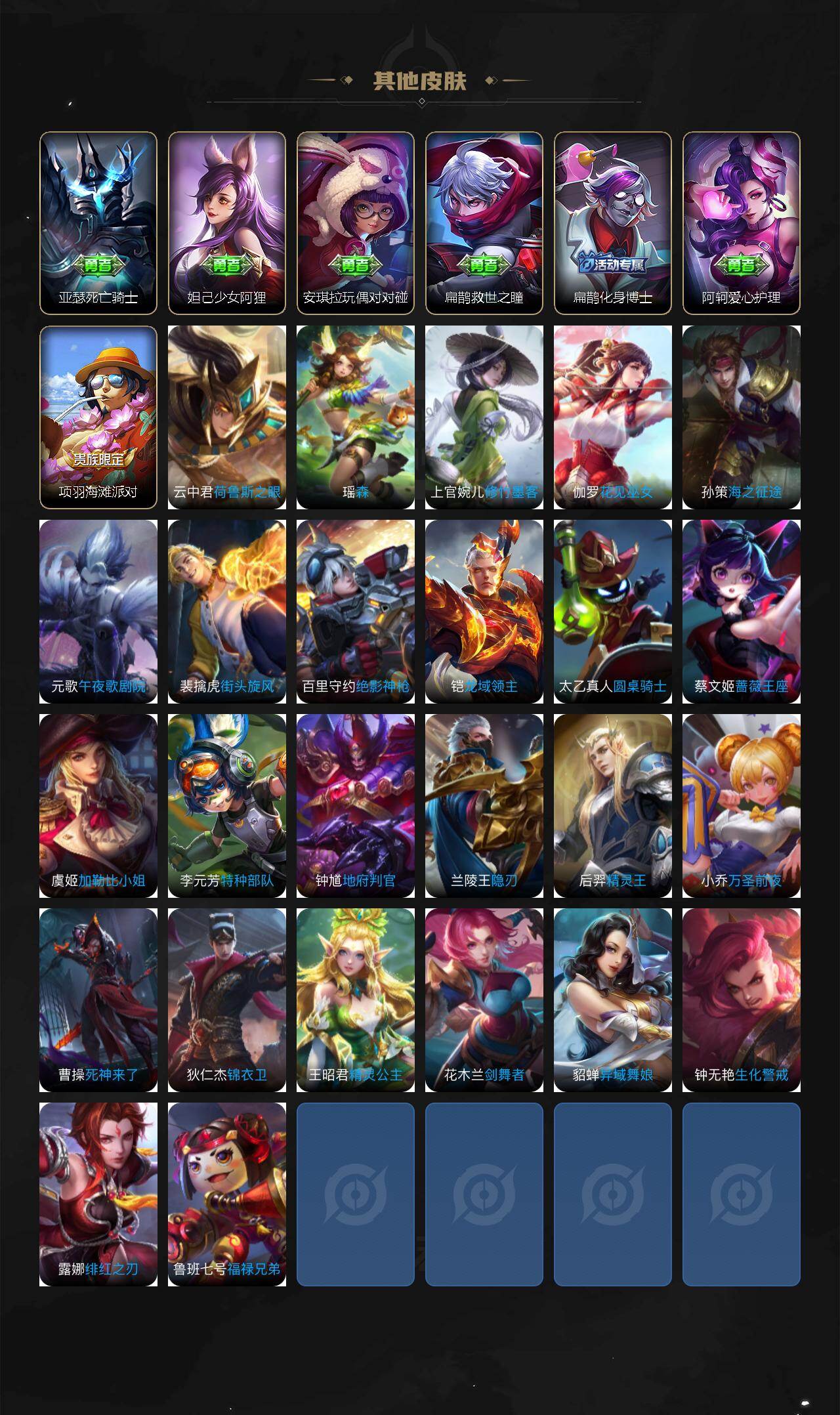 【传说皮肤】:虞姬启明星使,后羿黄金射手座,貂蝉仲夏夜之梦,孙尚香末日机甲,宫本武藏地狱之眼,孙悟空地狱火,狄仁杰超时空战士