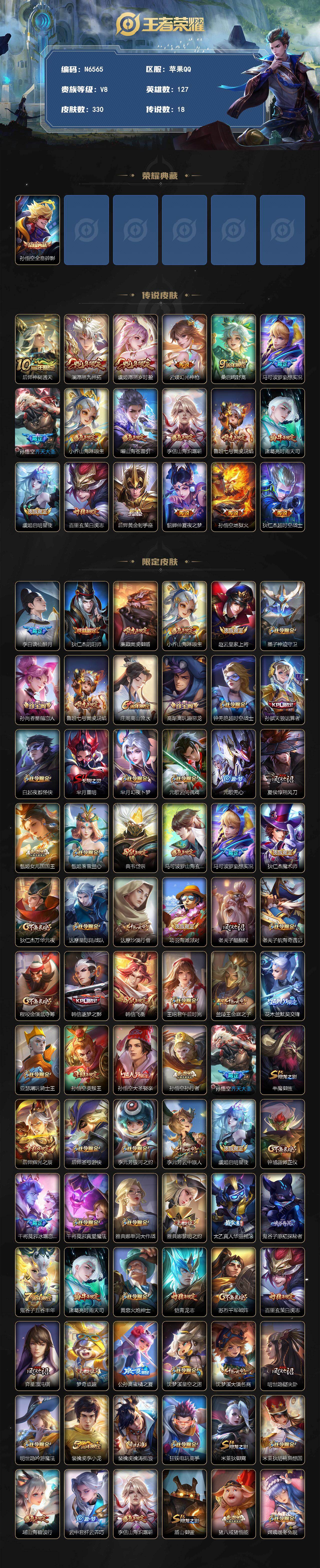 苹果Q-V6-至尊星耀II段位-127英雄-330皮肤-1典藏皮肤-18传说-89史诗