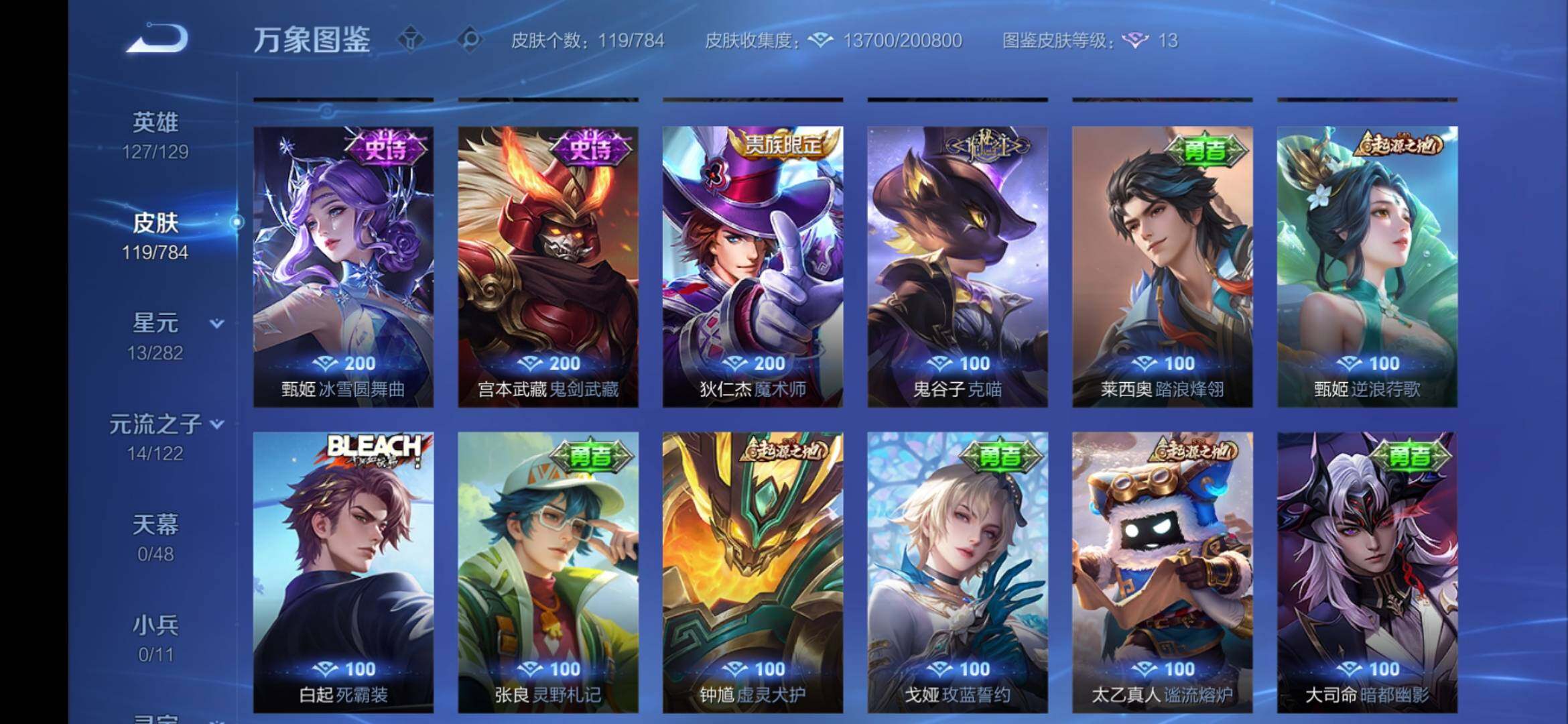 【限定】狄仁杰阴阳师,赵云皇家上将,嬴政优雅恋人,夏侯惇朔风刀,狄仁杰魔术师,狄仁杰万华元夜,达摩沙漠行僧,项羽海滩派对,老夫子醍醐杖,程咬金演武夺筹,兰陵王金庭之子,李元芳云中旅人,钟馗驱傩正仪,鬼谷子原初探秘者,鬼谷子五谷丰年,苏烈千军破阵,弈星混沌棋,沈梦