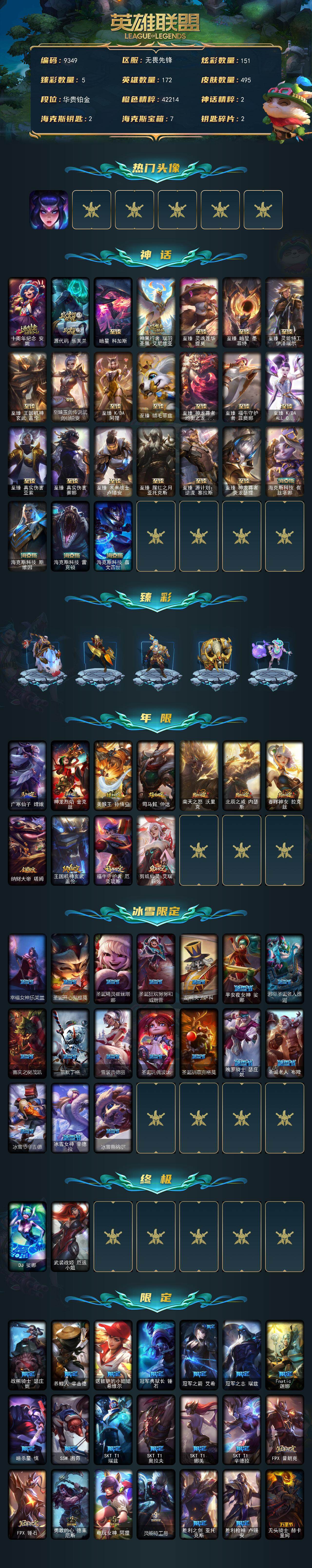 铂金段位-172英雄-495皮肤-151炫彩-2终极-24神话-66限定-63传说-