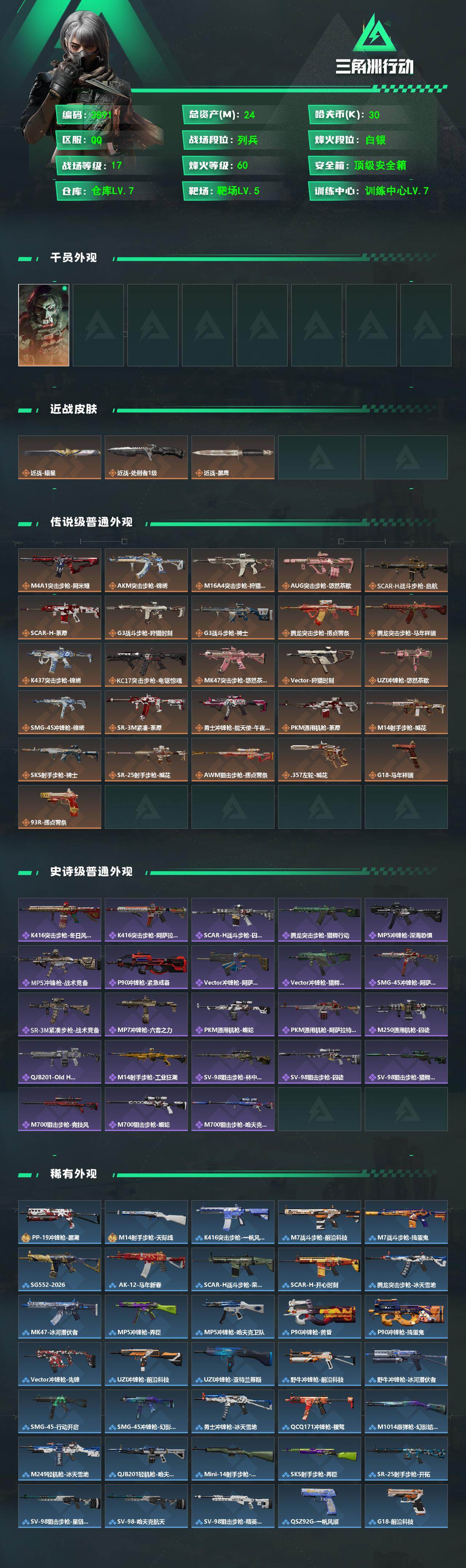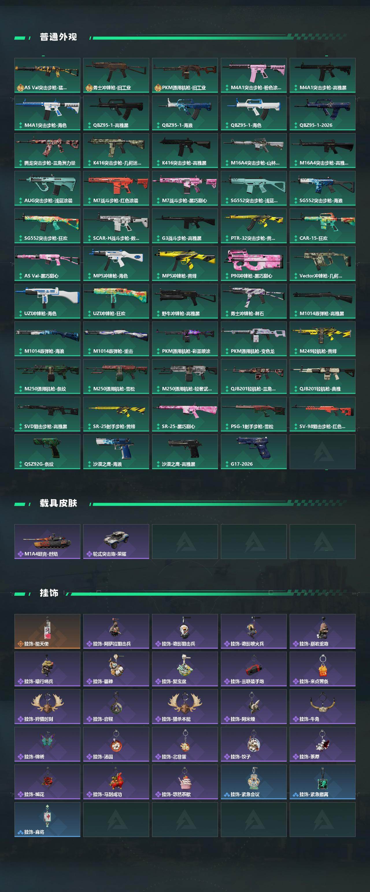 【传说外观】:M4A1突击步枪-阿米娅,AKM突击步枪-锦绣,M16A4突击步枪-狩猎时刻,AUG突击步枪-悠然茶歇,SCAR-H战斗步枪-启航,SCAR-H战斗步枪-荼蘼,G3战斗步枪-狩猎时刻,G3战斗步枪-骑士,腾龙突击步枪-捞点薯条,腾龙突击步枪-马年祥瑞,K