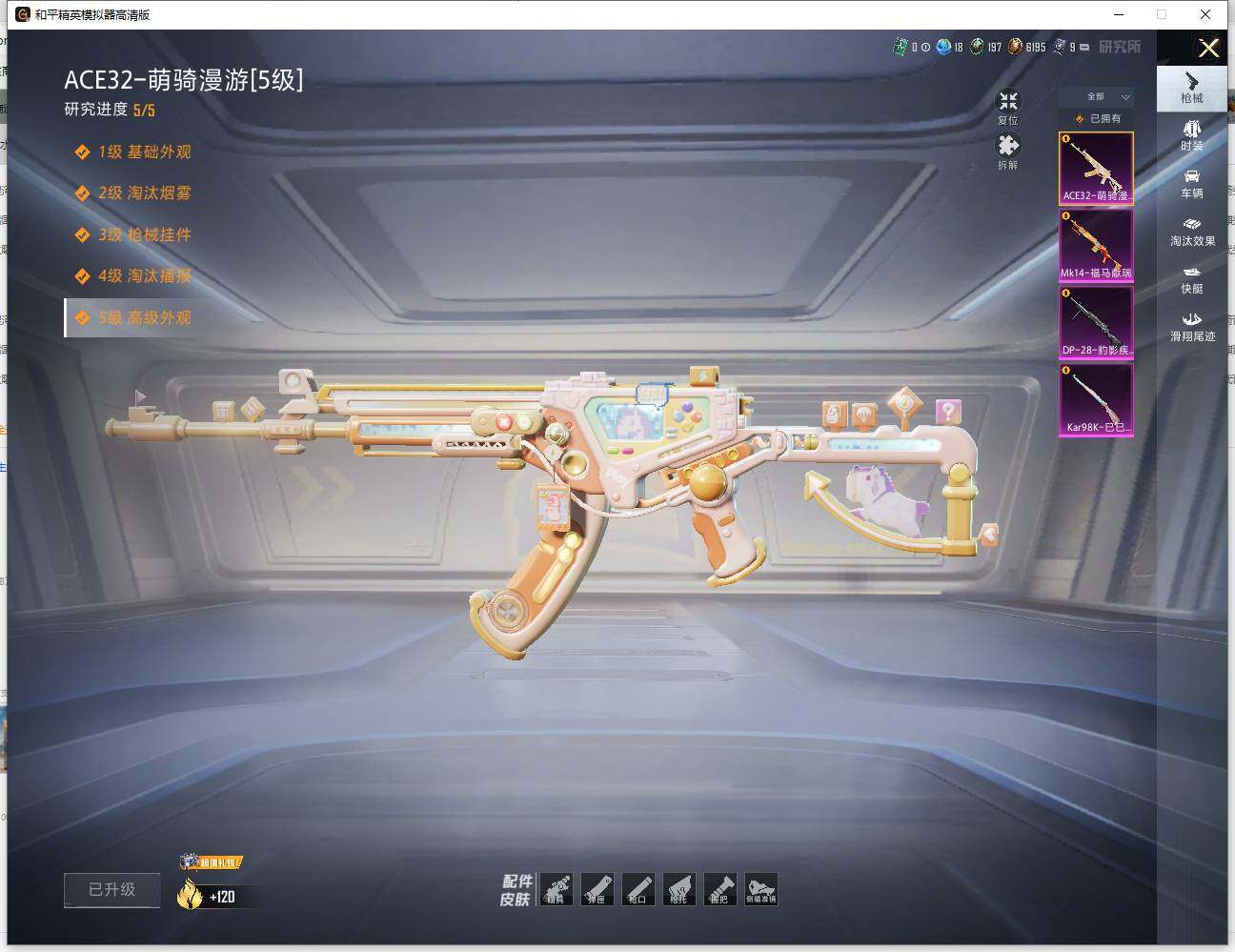 【粉色枪皮等级】:ACE32-萌骑漫游(五级),Kar98K-巳巳如意(五级),Mk14-福马献瑞(五级),DP-28-豹影疾电(五级)