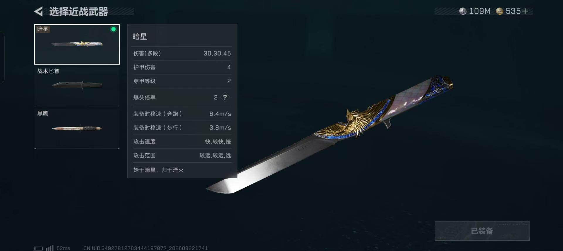【近战皮肤】:近战-暗星,近战-黑鹰