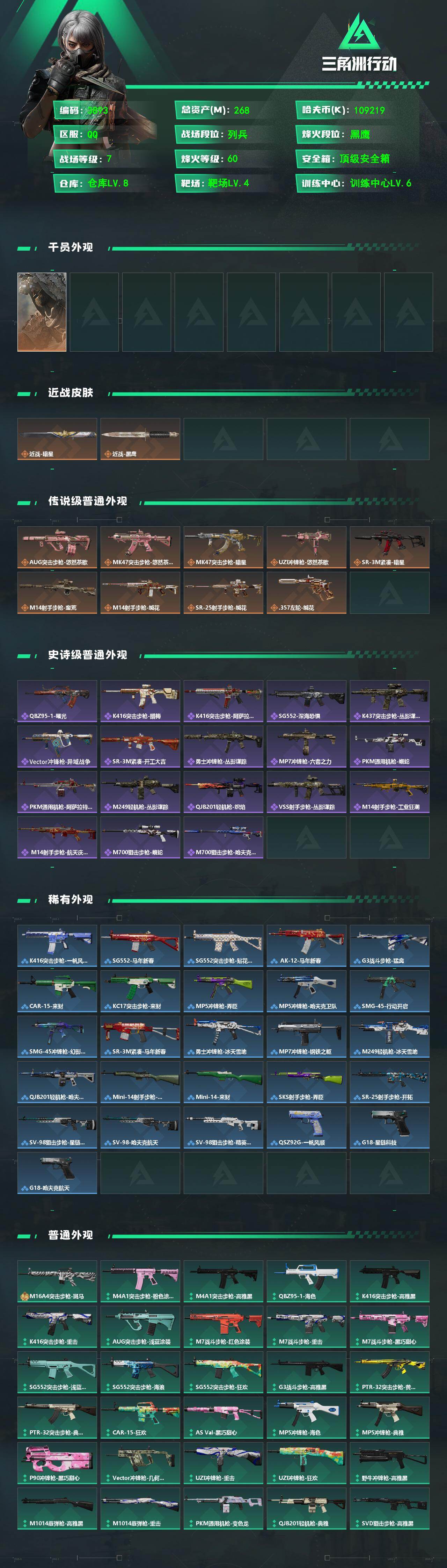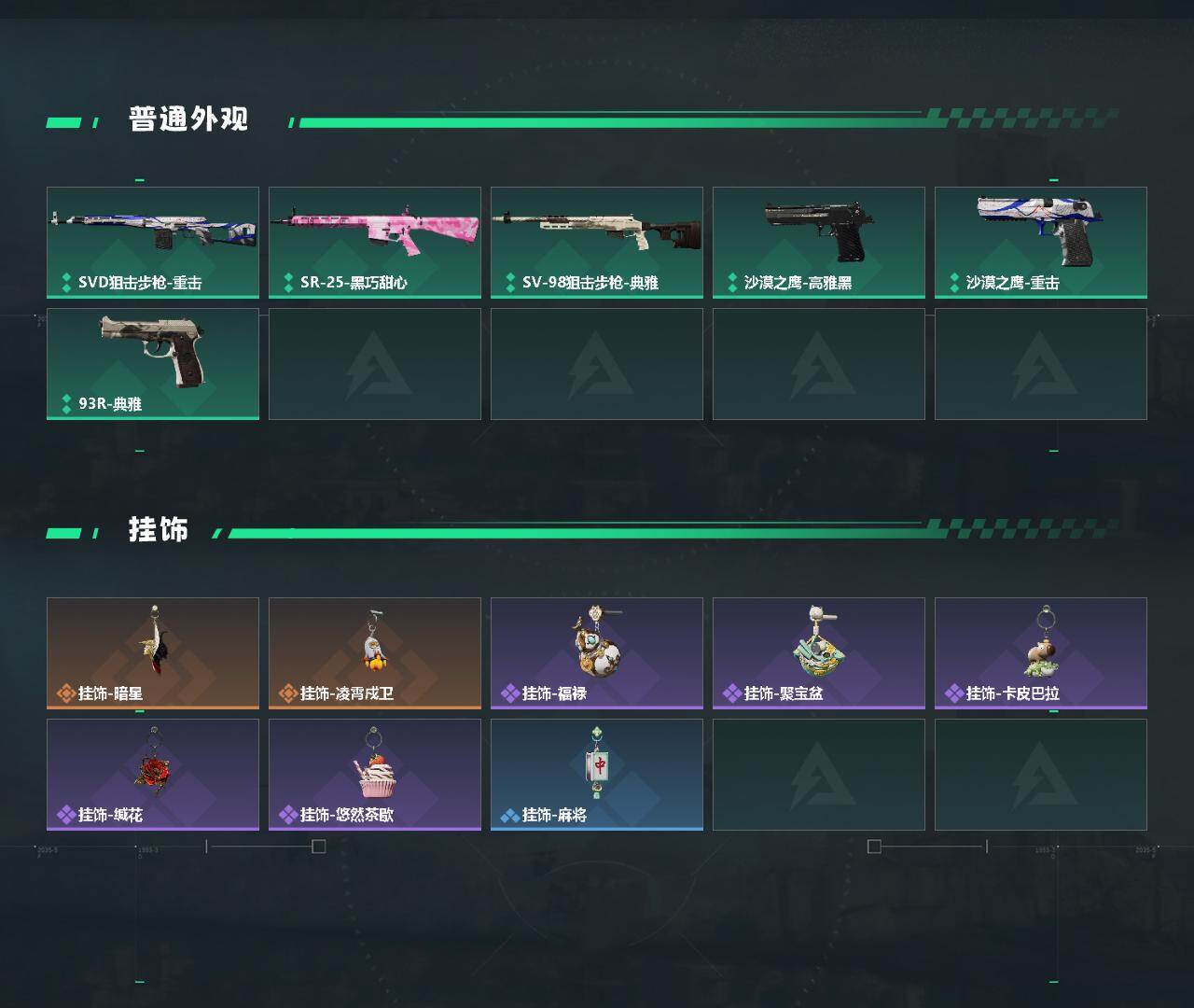 【传说外观】:AUG突击步枪-悠然茶歇,MK47突击步枪-悠然茶歇,MK47突击步枪-暗星,UZI冲锋枪-悠然茶歇,SR-3M紧凑突击步枪-暗星,M14射手步枪-蛮荒,M14射手步枪-缄花,SR-25射手步枪-缄花,.357左轮-缄花