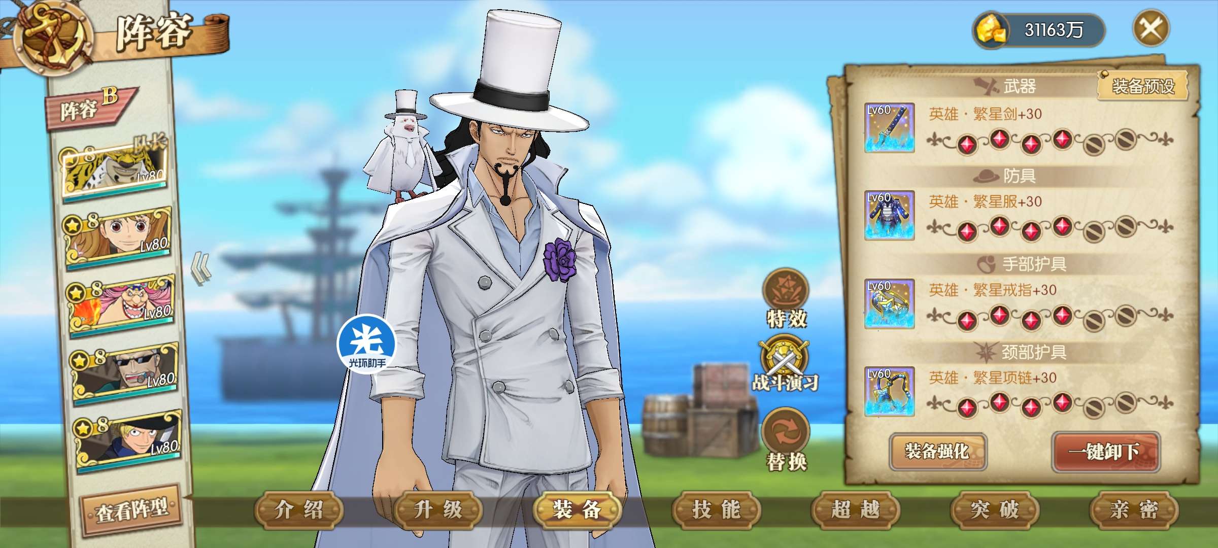 阵容可以配很多个,4套多速度宝石,鹰眼船8级,共振繁星,卫兵差几个孔,有六套皮肤,可小刀,边玩边出。