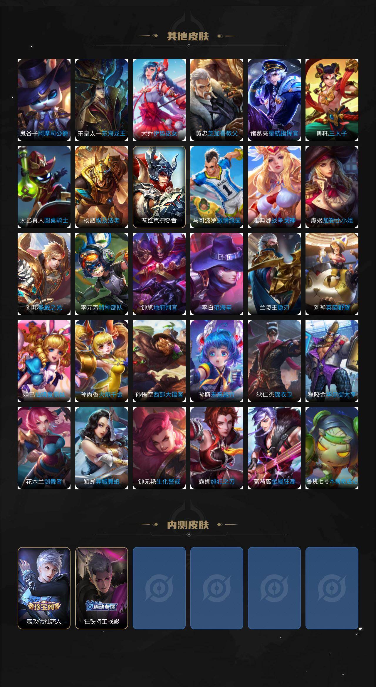 【限定皮肤】:白起狰,蒙犽顽岩魄,大乔绒语心约,姜子牙天穹之誓,狄仁杰阴阳师,虞姬凯尔特女王,赵云皇家上将,嬴政优雅恋人,庄周蜃楼王,高渐离死亡摇滚,孙膑妖精王,扁鹊炼金王,芈月重明,夏侯惇朔风刀,曹操烛龙,典韦穷奇,狄仁杰魔术师,达摩沙漠行僧,项羽海滩派对,程咬金演武夺筹,王昭君午后时光,兰陵王金庭