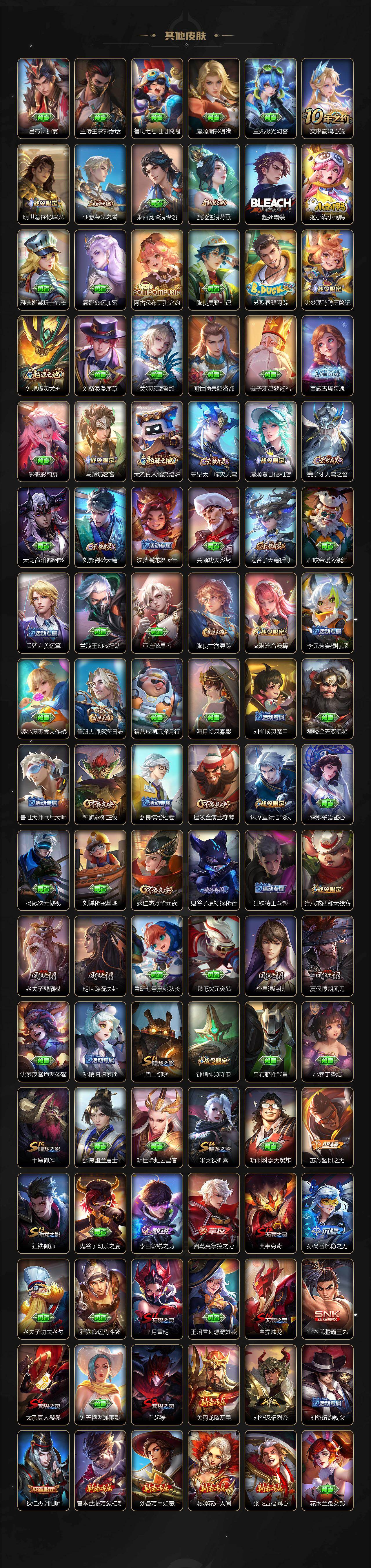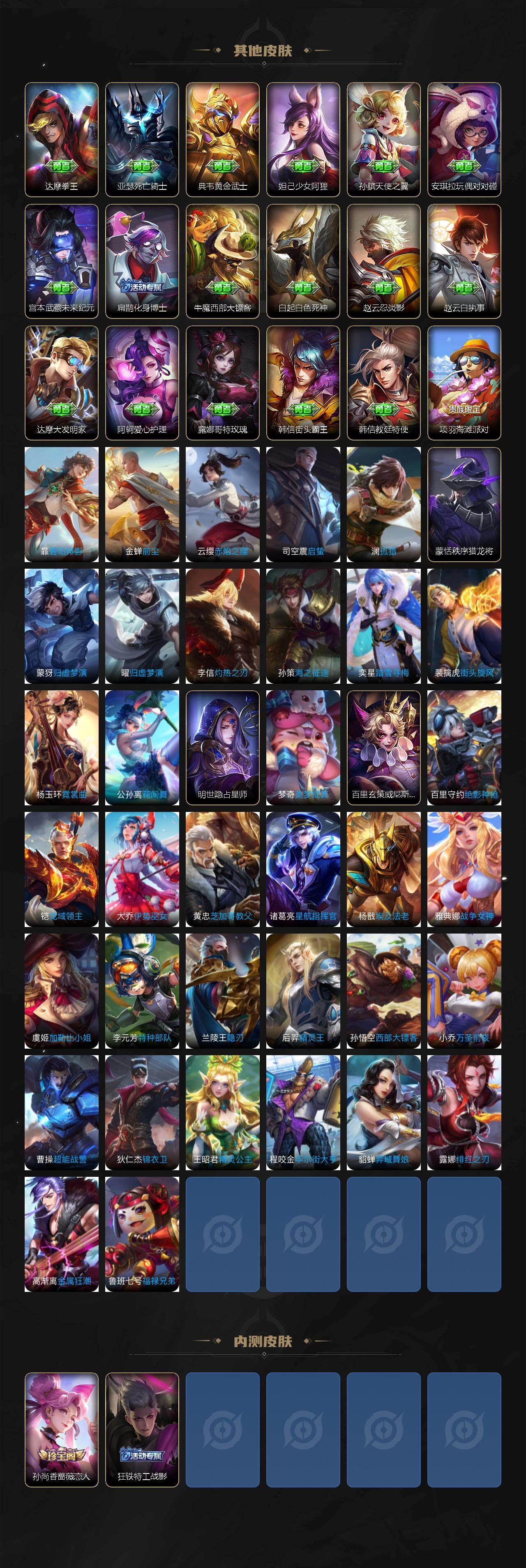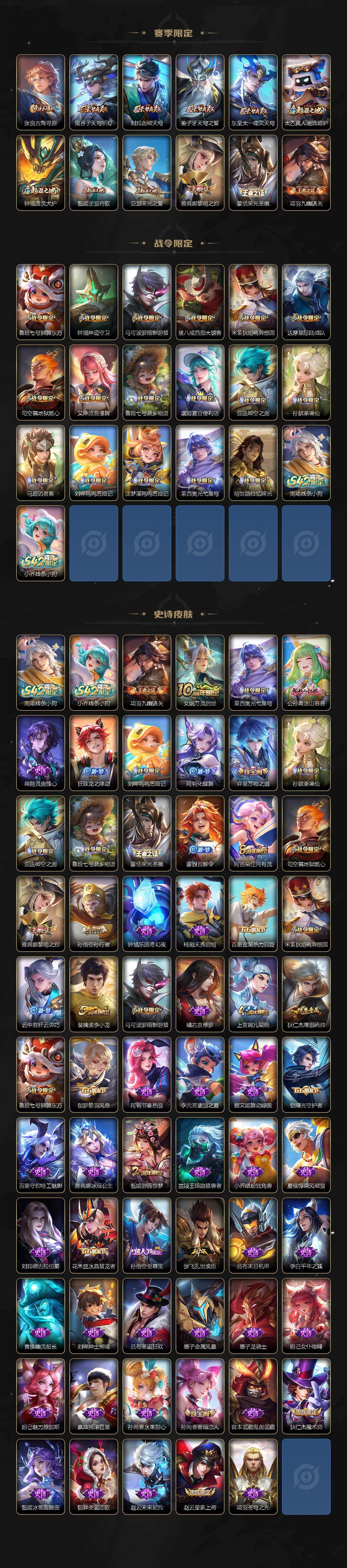 【限定皮肤】:白起狰,虞姬夏日便利店,姜子牙天穹之誓,狄仁杰阴阳师,赵云皇家上将,孙尚香蔷薇恋人,鲁班七号狮舞东方,芈月重明,夏侯惇朔风刀,甄姬游园惊梦,曹