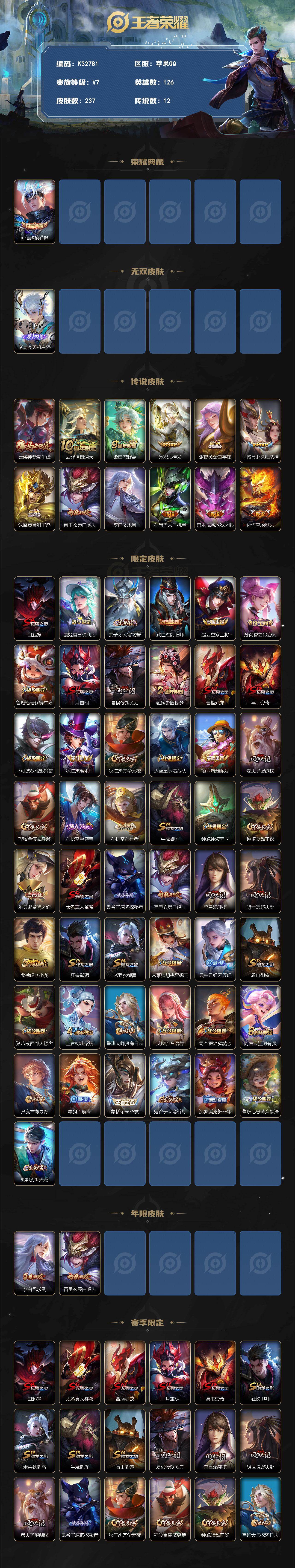 苹果Q-V7-最强王者段位-126英雄-237皮肤-1典藏皮肤-1无双-12传说-64史诗