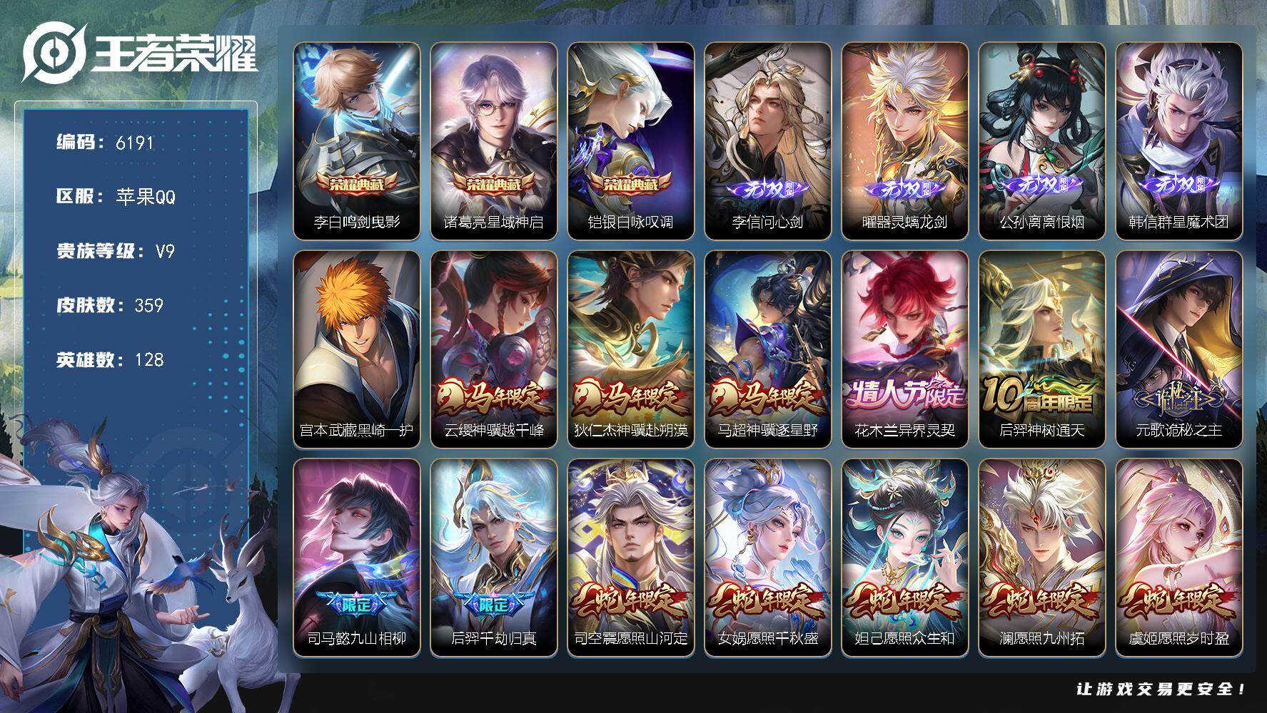 162-[17871083]可二次 贵族9-墨染江湖天幕-贵族积分166010-打野50段-金标曜、项羽、宫本武藏、司马懿、韩信、妲己-9309战力马超-359皮-3典藏-4无双-1珍品传说-45传说-8全皮英雄-3改名卡 苹果手Q99区 营地ID1812616090至圣王者【珍品传说皮肤】:黑崎一护【无双皮肤】:离恨烟,问心剑,器灵·螭龙剑,群星魔术团【荣耀典藏】:银白咏叹调,星域神启,鸣剑·曳影【优质限定皮肤】:白虎志,神威,至尊宝,山海·炽霜斩,无双飞将【传说皮肤】:乞巧织情,星穹之声,落
