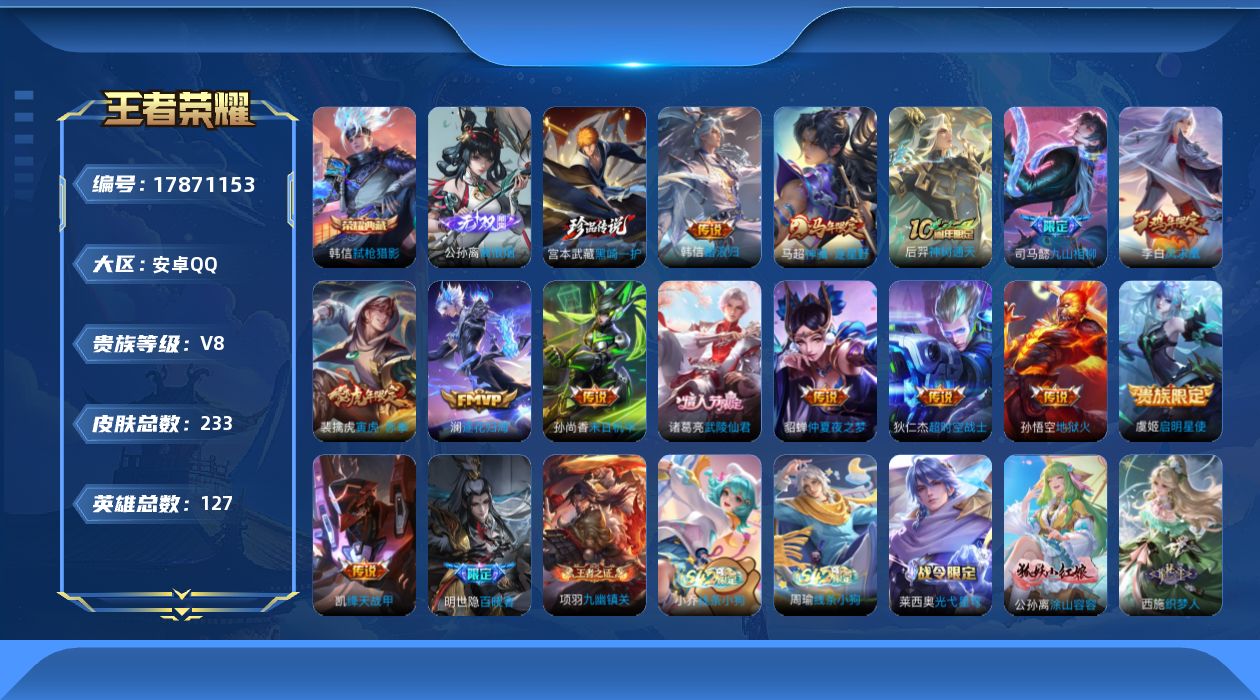 844-[17871153]贵族8-贵族积分54013-233皮-1典藏-1无双-1珍品传说-14传说-4全皮英雄-7改名卡 安卓手Q132区 营地ID338587329无双王者【珍品传说皮肤】:黑崎一护【无双皮肤】:离恨烟【荣耀典藏】:弑枪猎影【优质限定皮肤】:至尊宝,凤求凰【传说皮肤】:逐花归海,启明星使,踏浪归,神骥·逐星野,神树通天,九山相柳,绛天战甲,寅虎·赤拳,武陵仙君,仲夏夜之梦,凤求凰,地狱火,末日机甲,超时空战士【史诗皮肤】:九幽镇关,乘风破浪,百晓客,末日机甲,埋骨钱,线条小