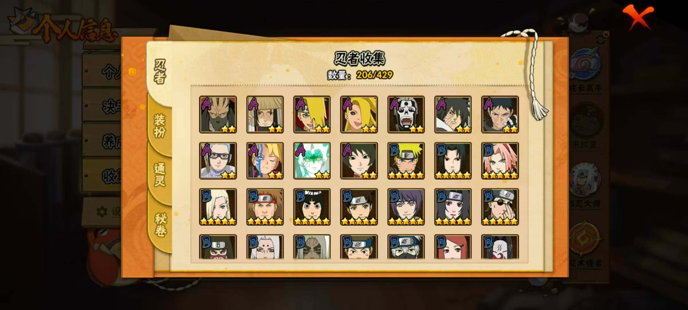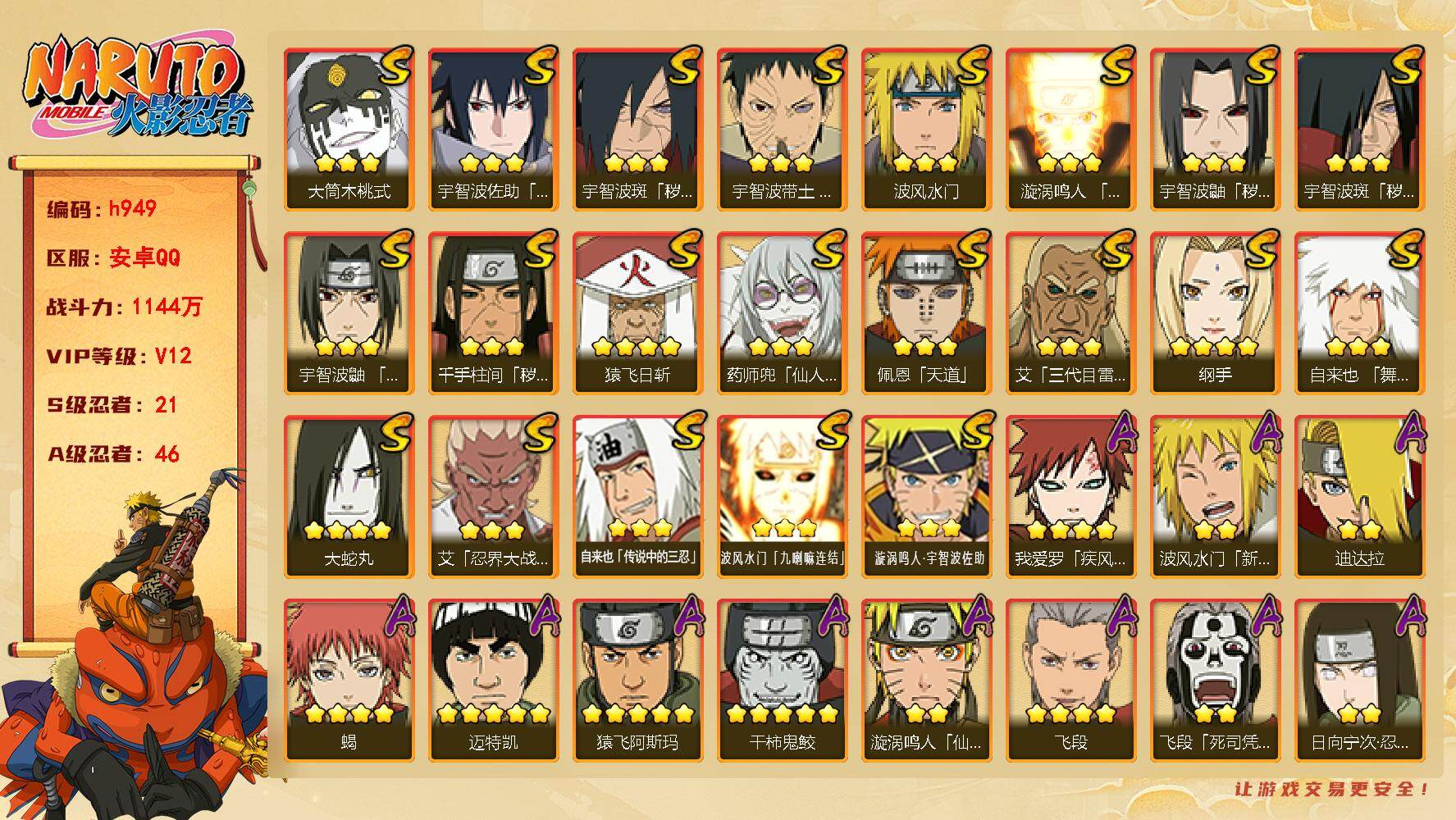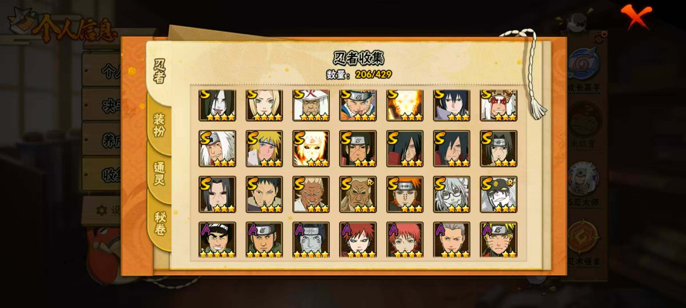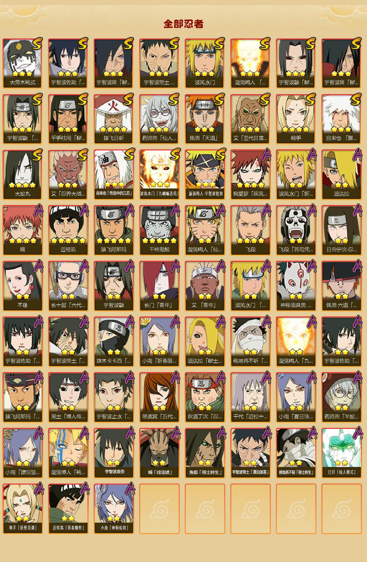 21S级忍者数-46A级忍者数【S级忍者】:千手柱间「秽土转生」(3星),宇智波鼬「秽土转生」(3星),宇智波斑「秽土转生」(3星),宇智波斑「秽土转生·解」(3星),宇智波带土「忍界大战」(3星),艾「忍界大战」(3星),宇智波鼬「须佐能乎」(3星),艾「三代目雷影」(3星),自来也「舞之豪杰」(3星),大蛇丸(4星),自来也「传说中的三忍」(3星),纲手(4星),猿飞日斩(4星),波风水门(3星),药师兜「仙人模式」(3星),漩涡鸣人「九喇嘛连结」(3星),佩恩「天道」(3星),宇智波佐助「