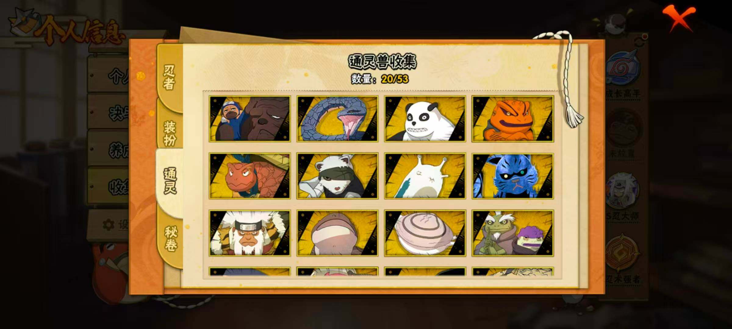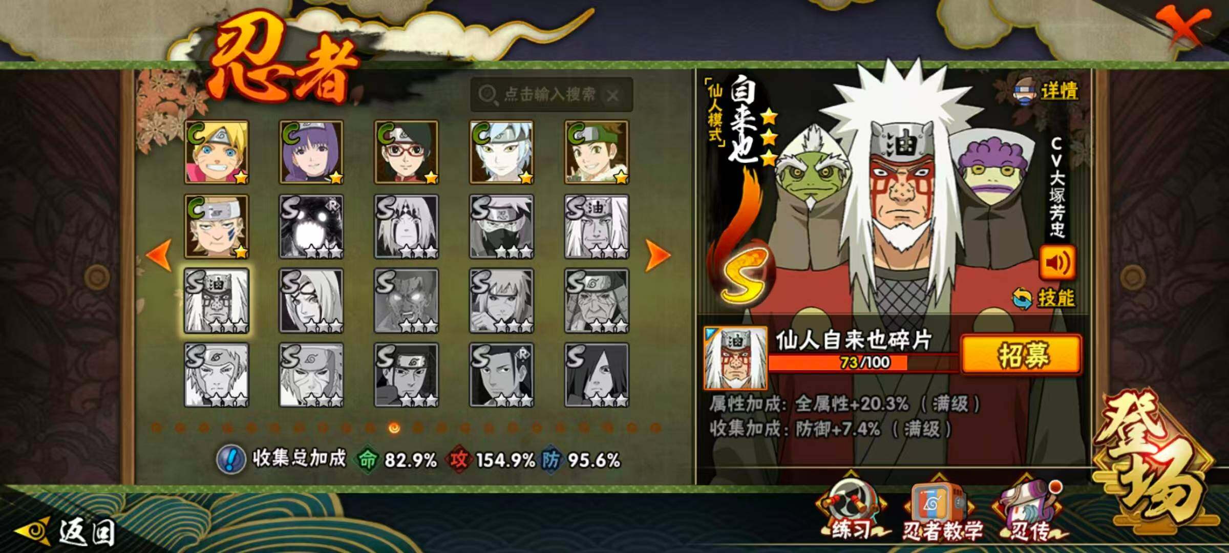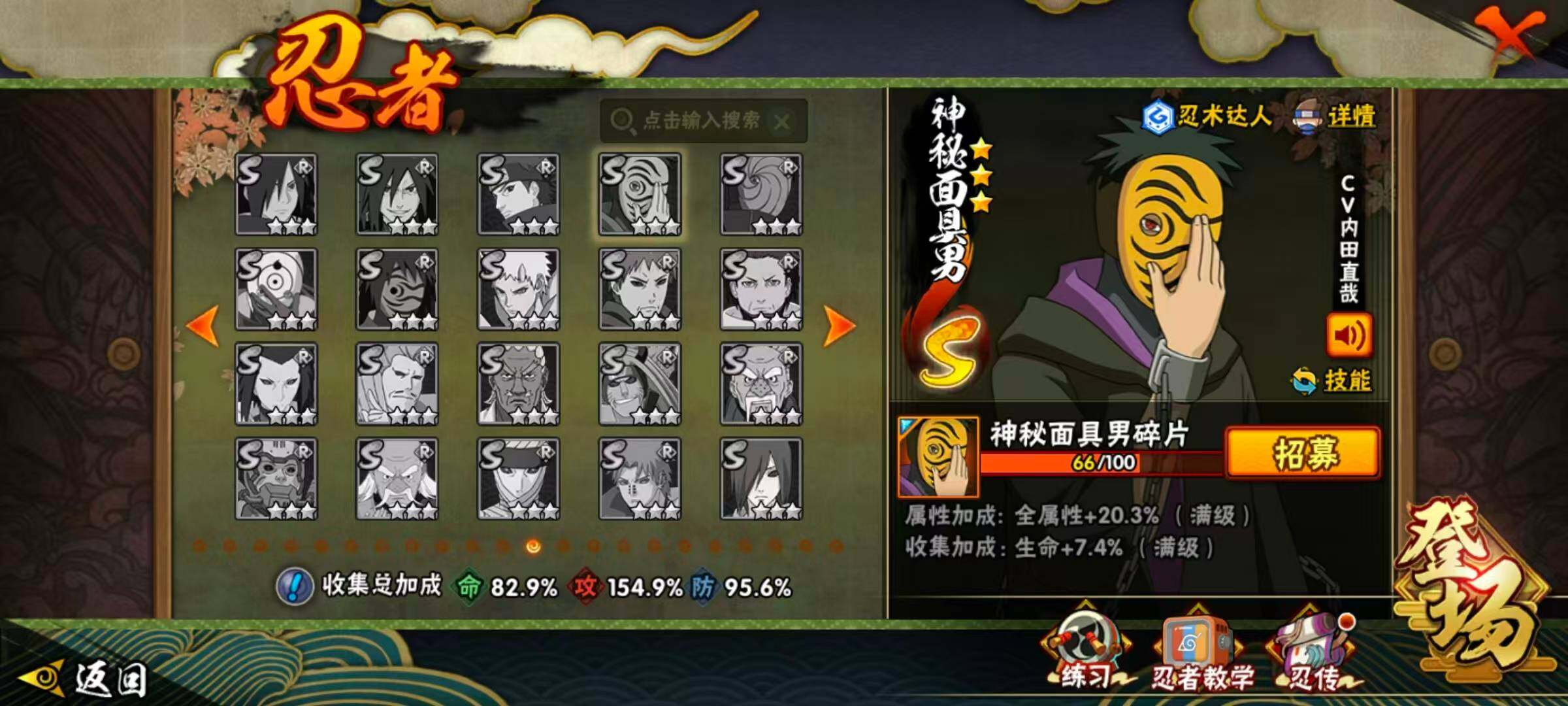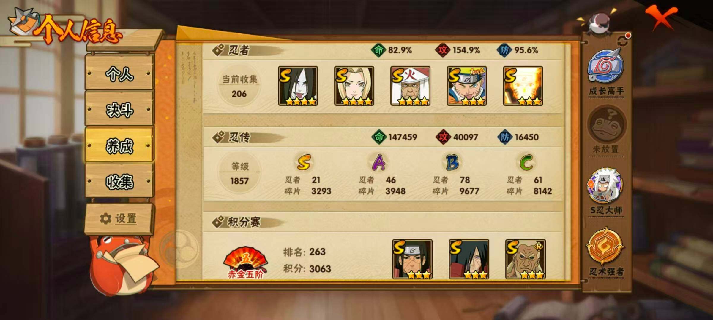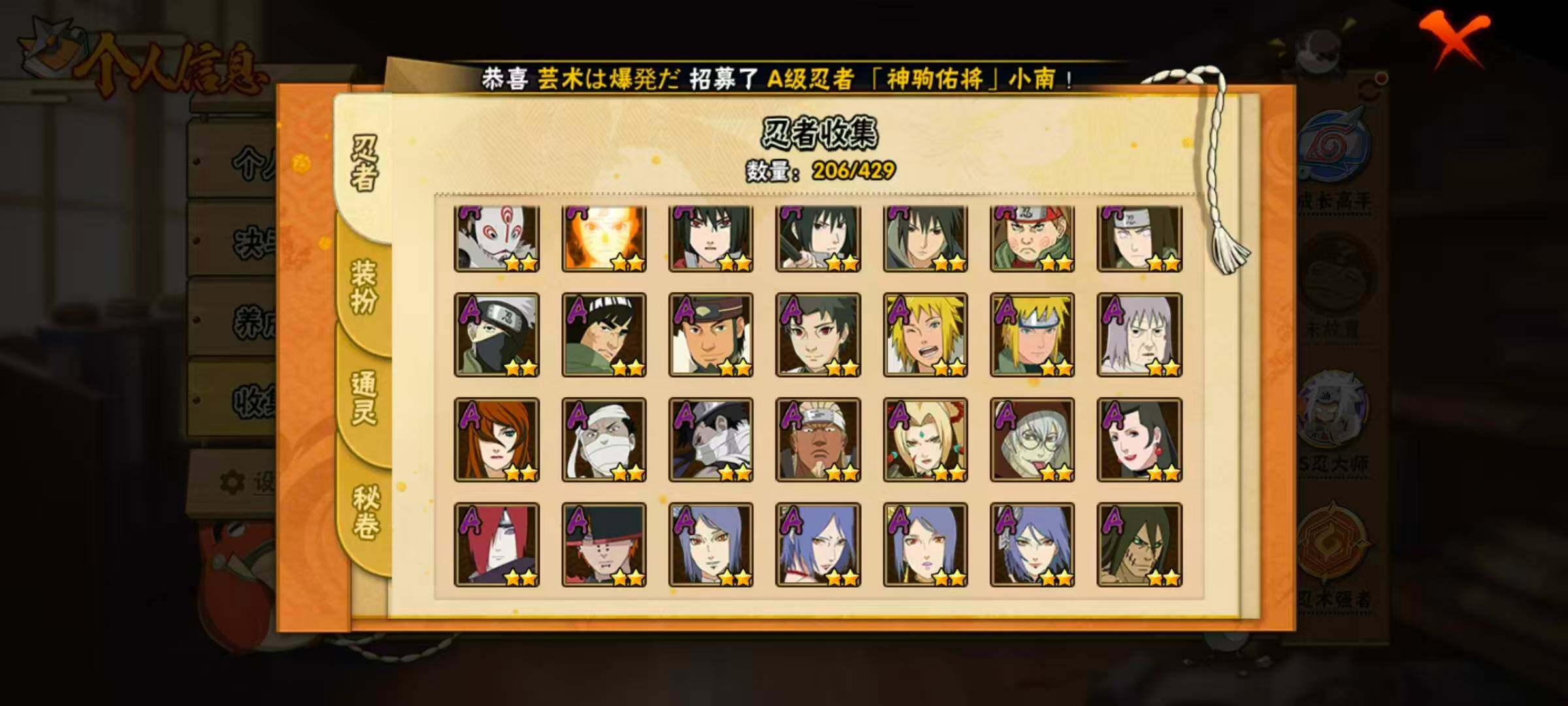 21S级忍者数-46A级忍者数【S级忍者】:千手柱间「秽土转生」(3星),宇智波鼬「秽土转生」(3星),宇智波斑「秽土转生」(3星),宇智波斑「秽土转生·解」(3星),宇智波带土「忍界大战」(3星),艾「忍界大战」(3星),宇智波鼬「须佐能乎」(3星),艾「三代目雷影」(3星),自来也「舞之豪杰」(3星),大蛇丸(4星),自来也「传说中的三忍」(3星),纲手(4星),猿飞日斩(4星),波风水门(3星),药师兜「仙人模式」(3星),漩涡鸣人「九喇嘛连结」(3星),佩恩「天道」(3星),宇智波佐助「