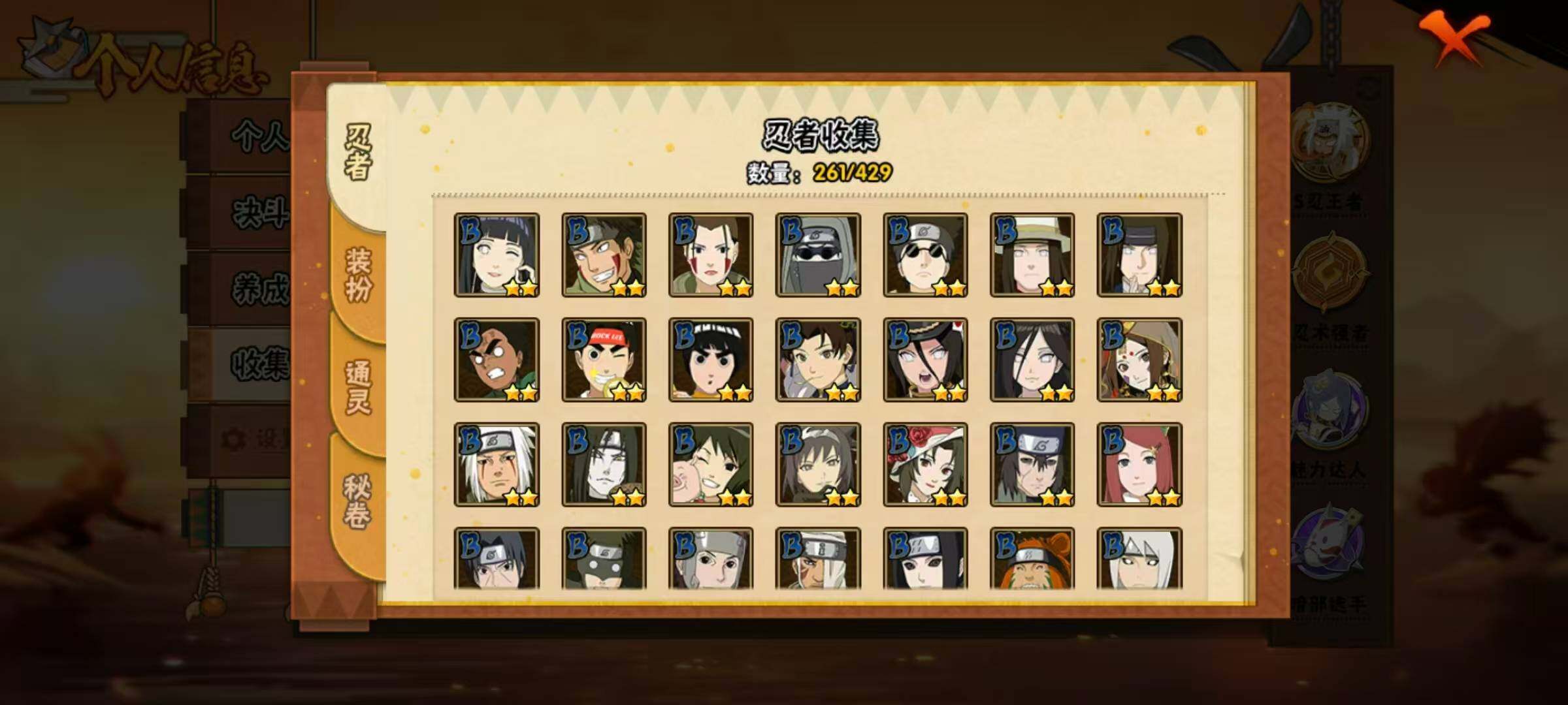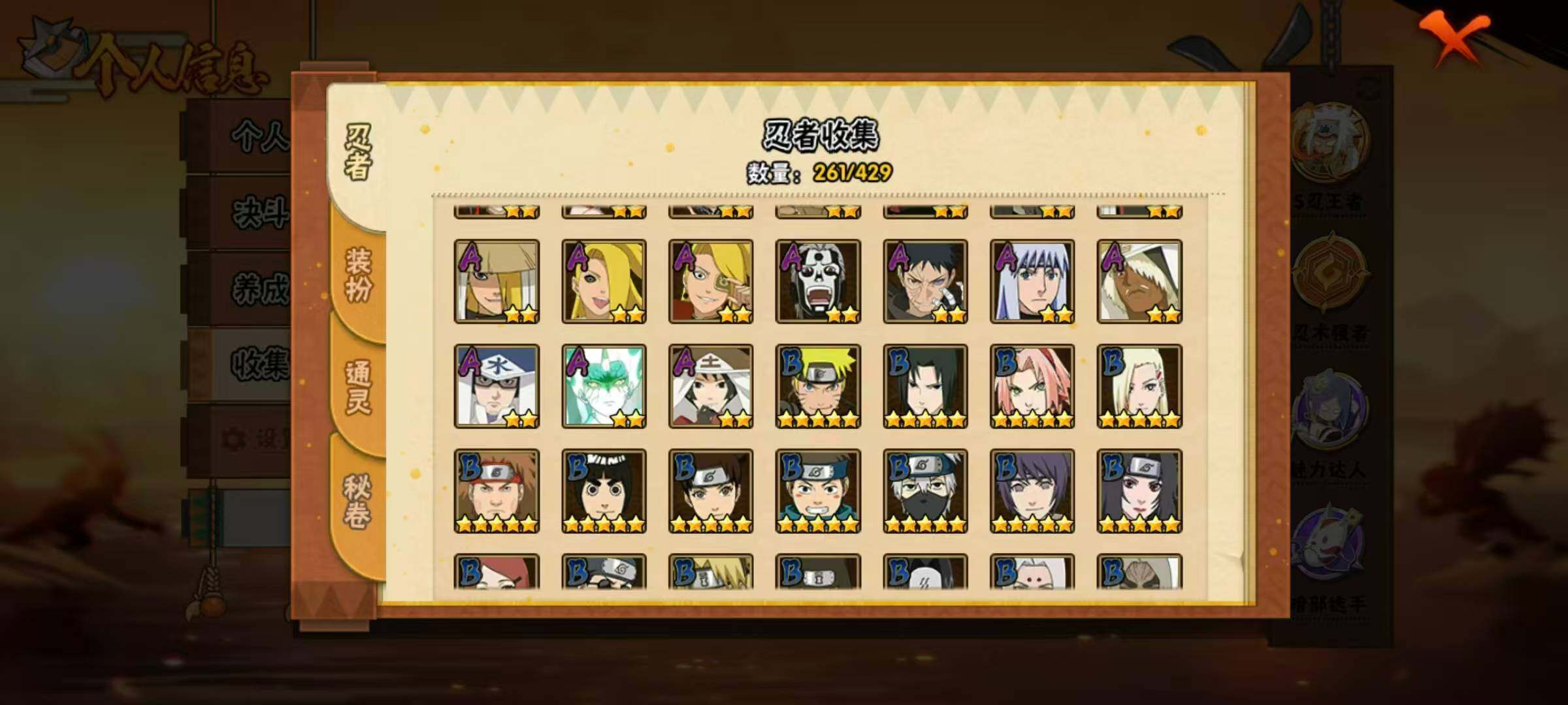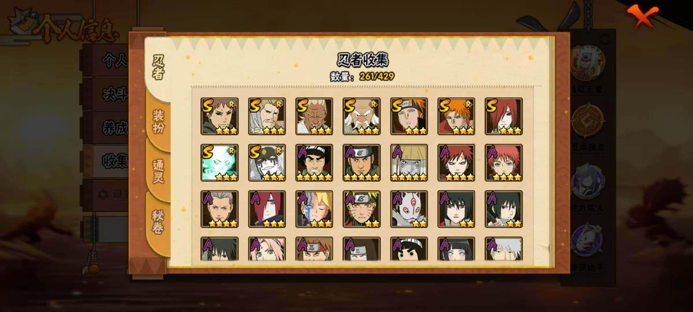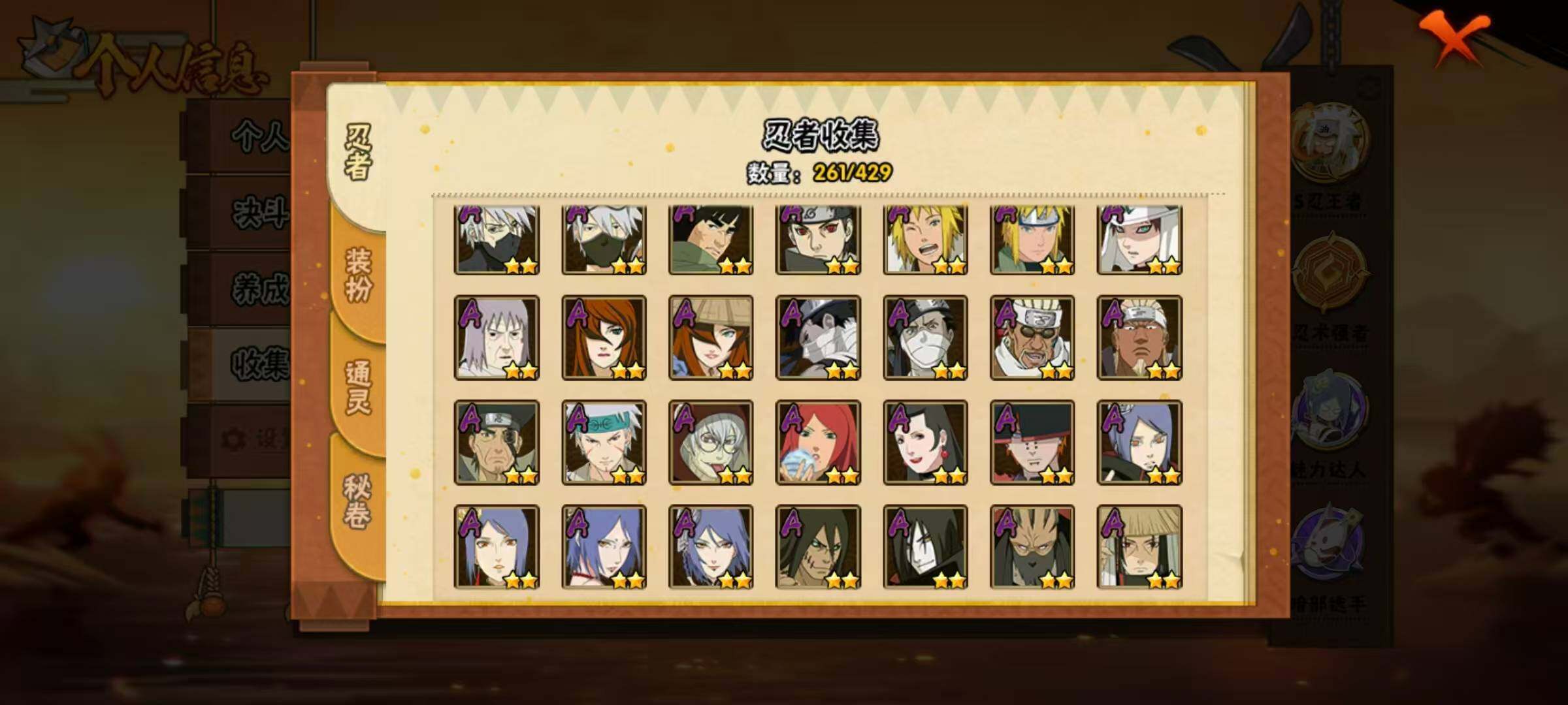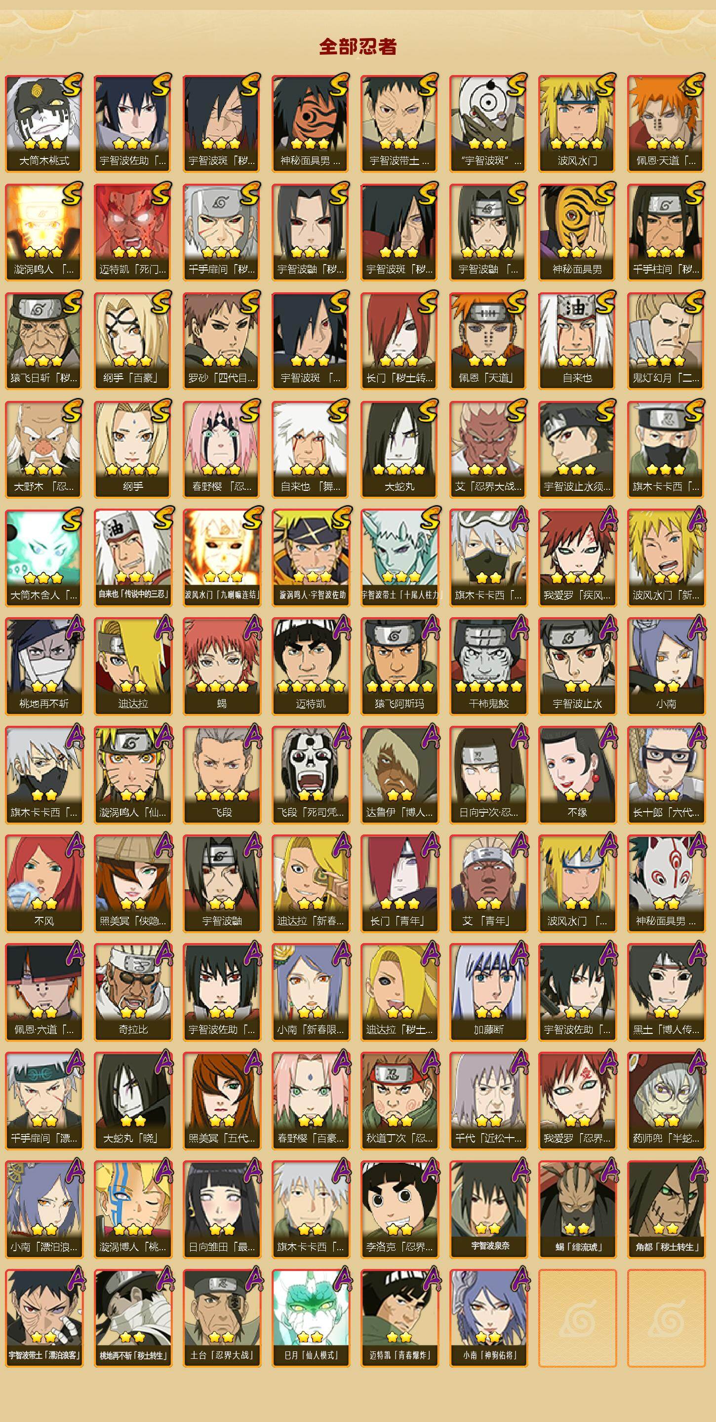37S级忍者数-57A级忍者数【S级忍者】:长门「秽土转生」(3星),猿飞日斩「秽土转生」(3星),千手扉间「秽土转生」(3星),千手柱间「秽土转生」(3星),宇智波鼬「秽土转生」(3星),宇智波斑「秽土转生」(3星),宇智波斑「秽土转生·解」(3星),大野木「忍界大战」(3星),春野樱「忍界大战」(3星),宇智波带土「忍界大战」(3星),艾「忍界大战」(3星),宇智波鼬「须佐能乎」(4星),宇智波止水「须佐能乎」(3星),旗木卡卡西「须佐能乎」(3星),宇智波斑「木叶创立」(3星),罗砂「四代