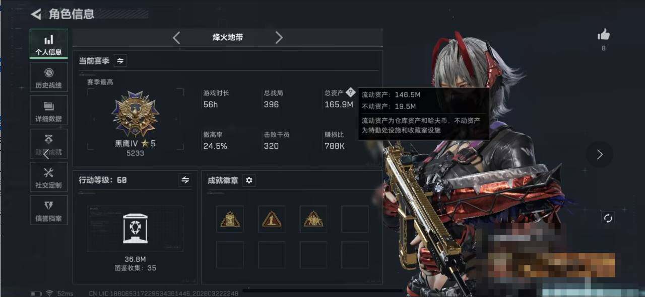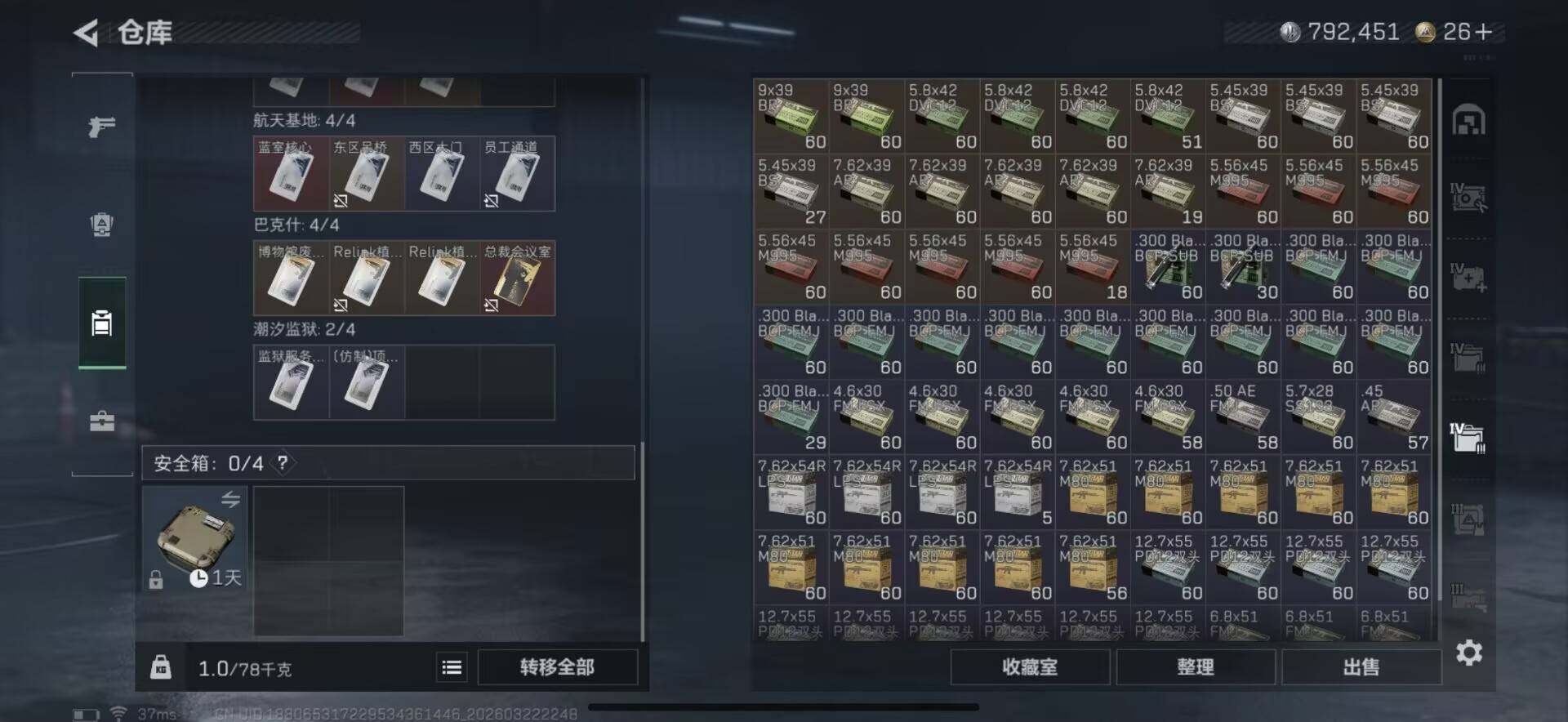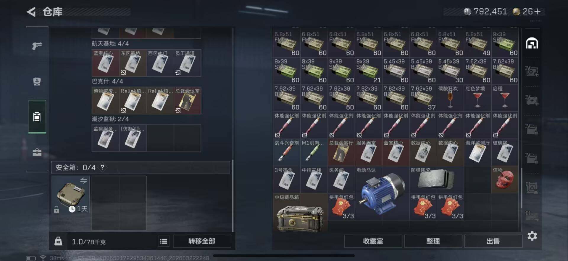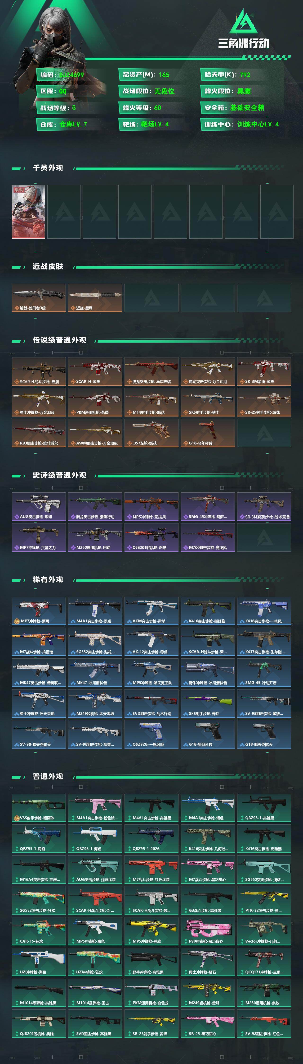 【SJZ4699】总资产(M):165M/哈夫币(K):792K/哈夫币(K):792K/传说枪皮数:14/全面战场等级:5_段位:无段位/烽火地带等级:60_段位:黑鹰/骇爪-维什戴尔/近战-处刑者3级/近战-黑鹰/SCAR-H战斗步枪-启航/SCAR-H战斗步枪-荼蘼/腾龙突击步枪-马年祥瑞/腾龙突击步枪-万金泪冠/SR-3M紧凑突击步枪-荼蘼/勇士冲锋枪-万金泪冠/PKM通用机枪-荼蘼/M14射手步枪-缄花/SKS射手步枪-骑士/SR-25射手步枪-缄花/R93狙击步枪-维什戴尔/AWM狙