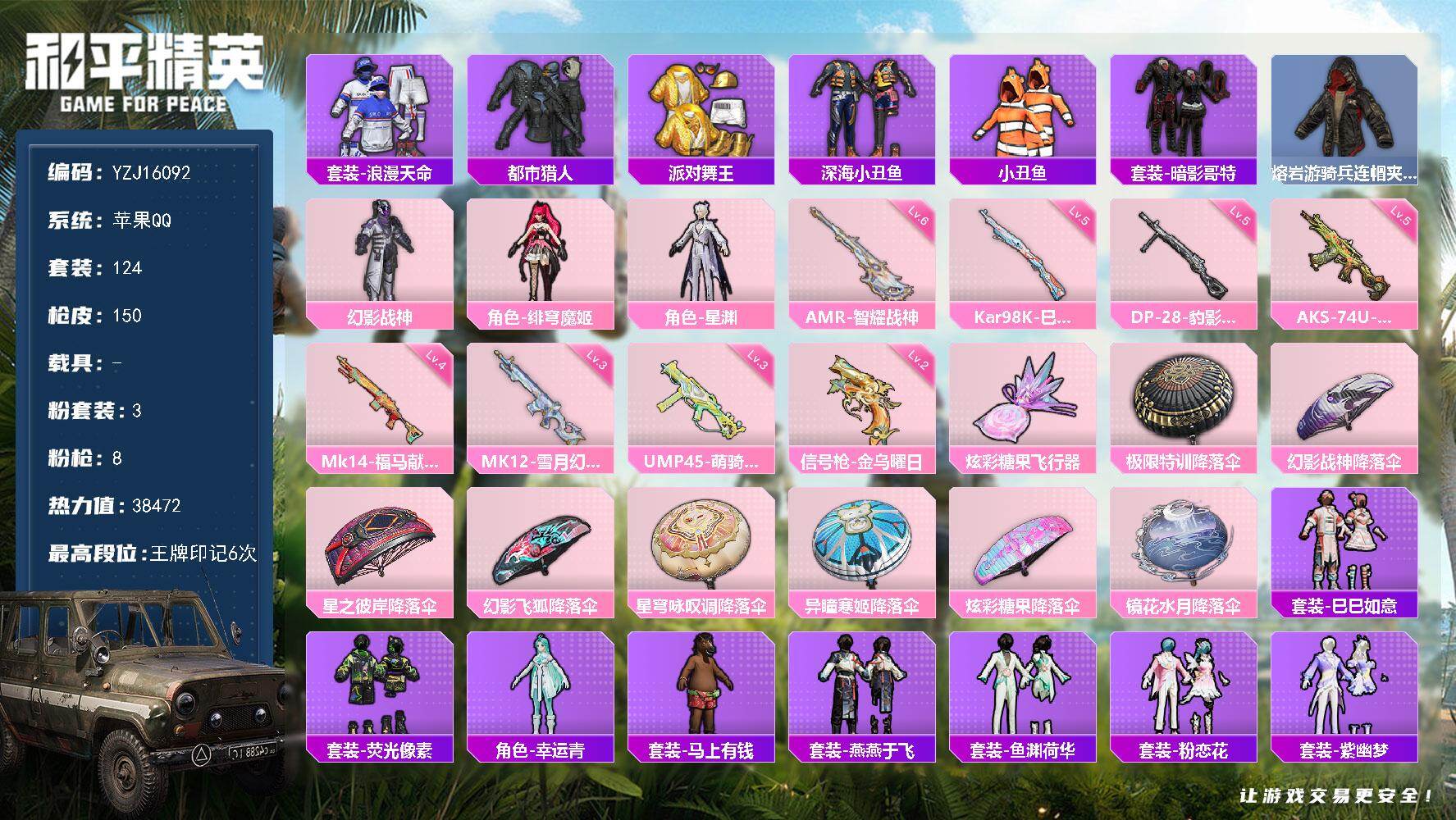 2521623_实名可改-苹果Q-4稀有3粉装8特效枪12热门【精品身法号可萌可身法伤感小雾神套装幻影战神绯穹魔姬浅蓝色牛仔衬衣都市金鞋双马尾红眼罩天命青涩年华小丑鱼幻世保卫者幸运青狂战萌兔6级AMR智耀战神幻影战神背包头盔6款飞行器】124套装150枪皮38472热力值6印记历史传奇王牌14星【4稀有】都市猎人浪漫天命派对舞王派对舞王(金靴子)【3粉装】绯穹魔姬星渊幻影战神【8特效枪】AKS-7