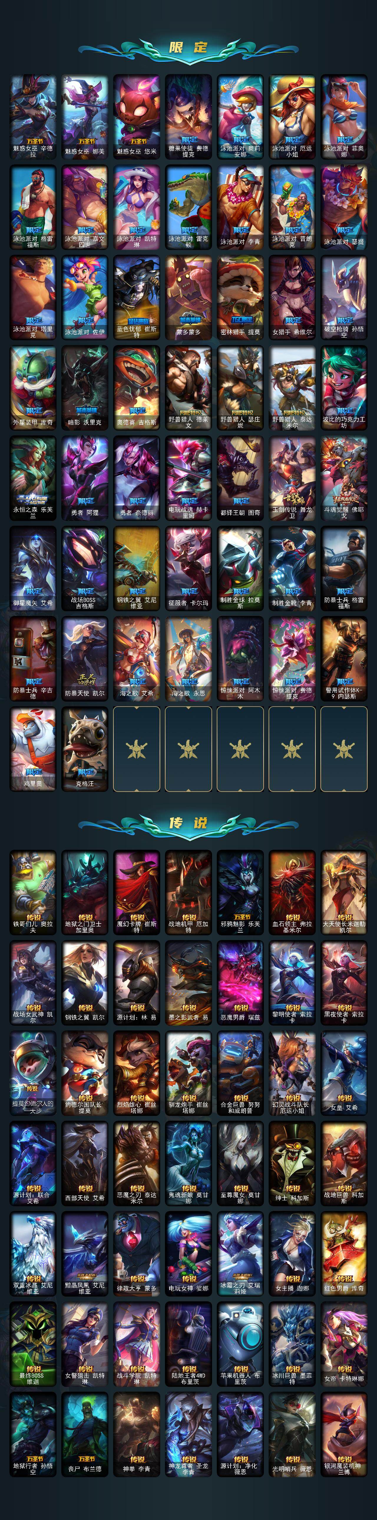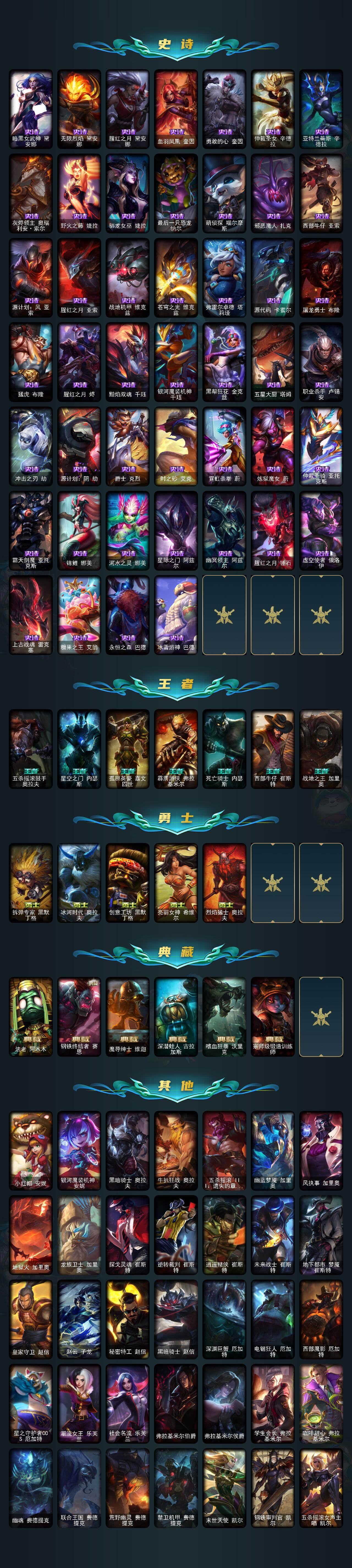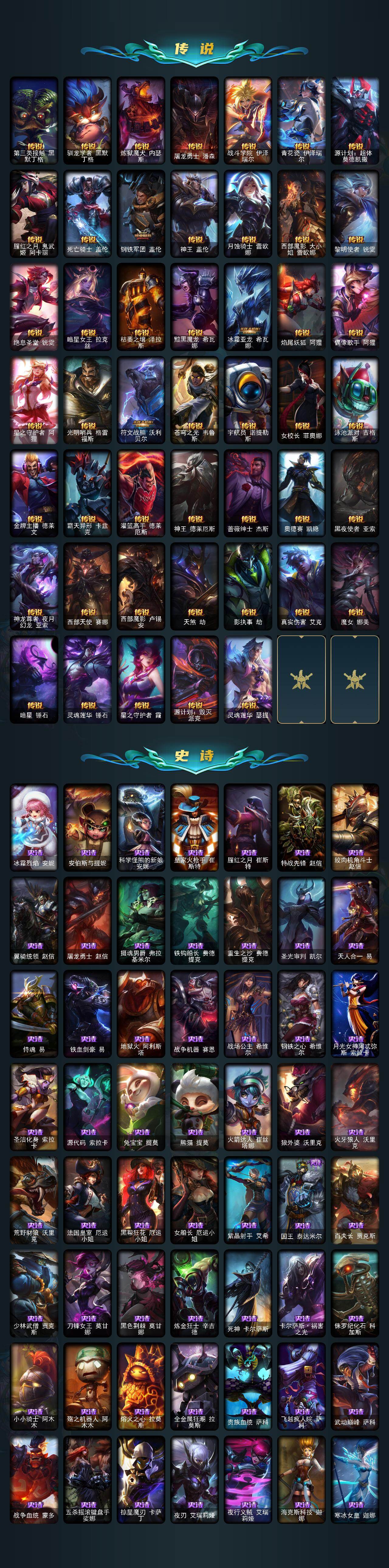 【神话皮肤】:殿堂传奇乐芙兰,十五周年纪念希维尔,神凰行者瑞羽圣凰艾尼维亚,灰烬骑士莫德凯撒,创世黑夜使者亚索